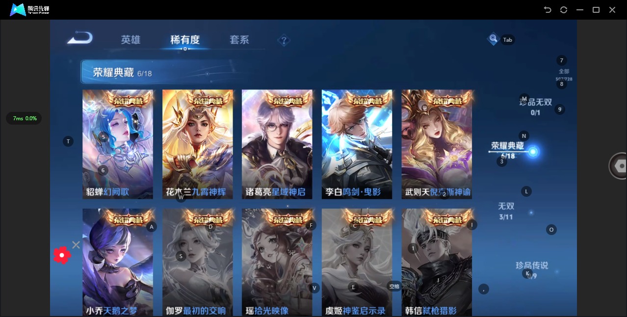 - PX_2086722-62 安卓QQ/至尊星耀/219皮肤/124英雄/1典藏/0珍品无双/0无双/0珍品传说/13传说/59史诗/8稀有英雄 【1 典藏皮肤】神鉴启示录 虞姬, 【13 传说皮肤】海洋之心 武则天,霜月吟 露娜,天魔缭乱 吕布,淬星耀世 赵云,音你闪耀 孙尚香,愿照·九州拓 澜,群星魔术团 云中君,愿照·众生和 妲己,愿照·福禄聚 蔡文姬,愿照·山河定 司空震,愿照·岁时盈 虞姬