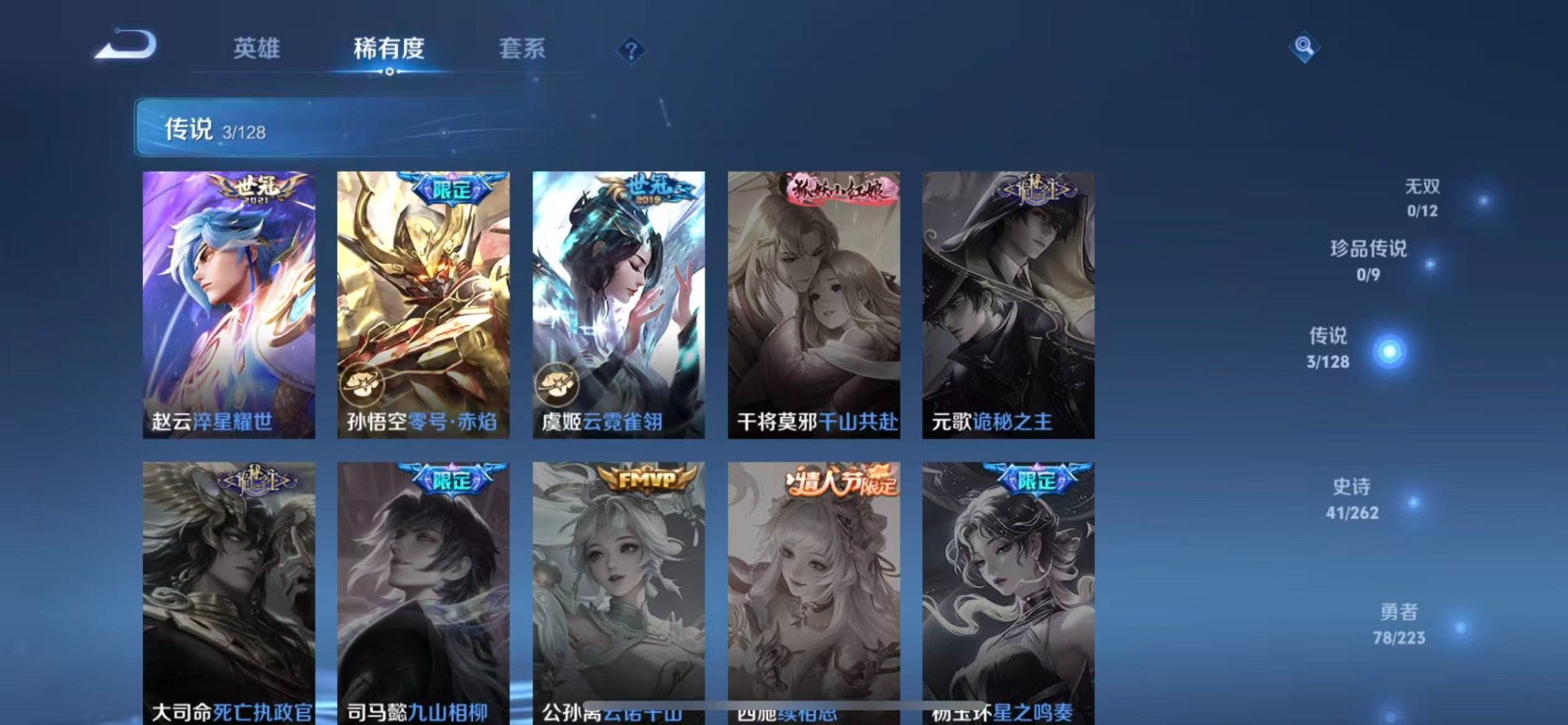 [12296175]V7 1典藏 3传说 120英雄 178皮肤 可修改实名 优质装备:弑枪猎影(韩信典藏),云霓雀翎,零号·赤焰,淬星耀世 珍宝阁皮:妄想食味 限定皮:至尊宝,高山流水,五谷丰年,梁祝,李小龙,孙行者,大圣娶亲 史诗皮:紫霞仙子,特工魅影,永昼,冰冠公主,偶像歌手,节奏热浪,水果甜心,幽灵船长,鬼剑武藏,纤云弄巧,拒霜思,乘风破浪,逐浪之夏,水晶猎龙者,曙光守护者,金属风暴,圣诞恋歌,鹰眼统帅,魅力维加斯,赏金猎手,奇遇舞章,无心