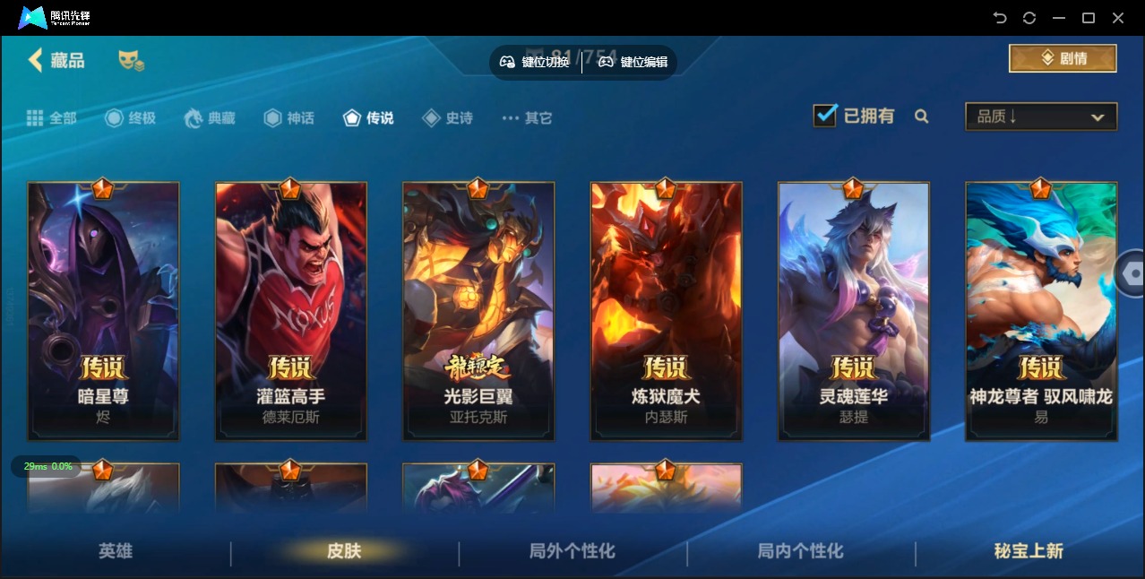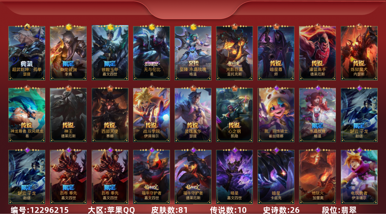 [12296215]1典藏 3神话 3限定 10传说 28史诗 81皮肤 可二次 可修改实名 优质装备:暗星尊,灌篮高手,炼狱魔犬,神龙尊者 驭风啸龙,神王诺手,西部天使赛娜,战斗学院ez,超武乾坤:孤拳,灵魂莲华腕豪,心之钢凯隐 段位:翡翠 神话皮:银鞍玉甲 嘉文四世,乘龙破渊 李青,至臻水晶格温 限定皮肤:赵云子龙,吕布奉先,无与伦比剑圣 传说皮:光影巨翼亚托克斯