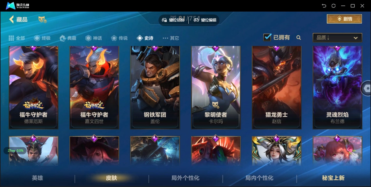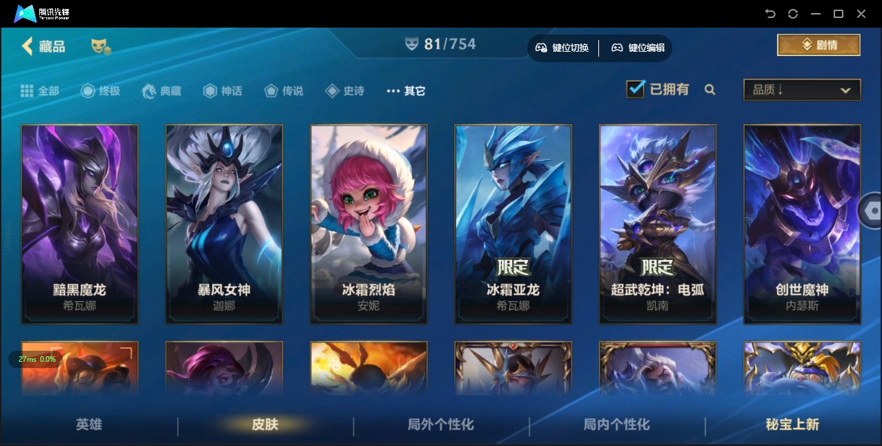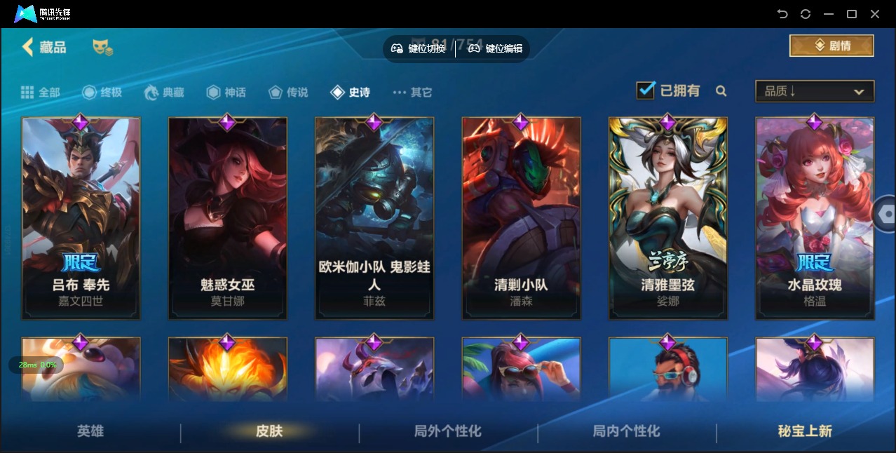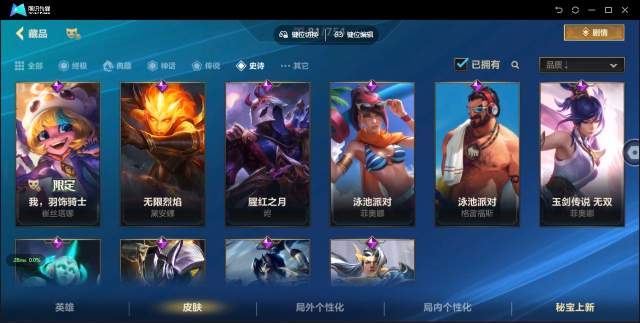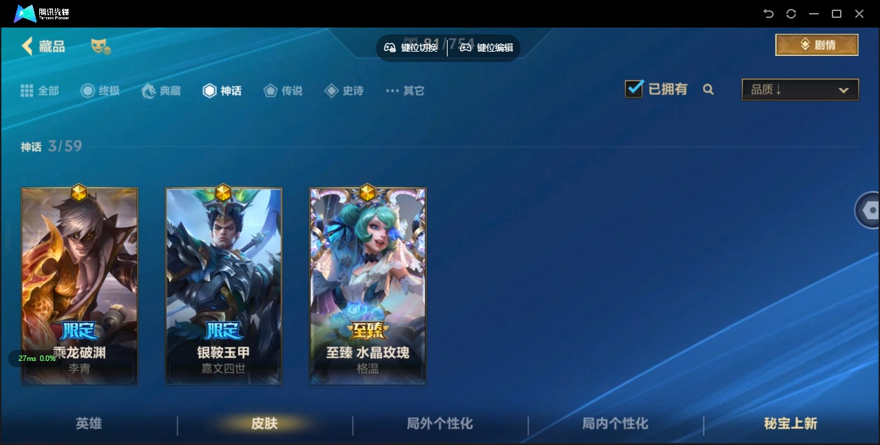 - PX_2096163-46 安卓QQ/荣耀黄金/224皮肤/121英雄/2典藏/0珍品无双/0无双/0珍品传说/18传说/61史诗/7稀有英雄 【2 典藏皮肤】鸣剑·曳影 李白,银白咏叹调 铠, 【18 传说皮肤】启明星使 虞姬,云霓雀翎 虞姬,前尘镜 娜可露露,无双飞将 马超,云鹰飞将 曜,深海之息 马可波罗,猫影幻舞 貂蝉,怒海麟威 吕布,时之恋人 刘备,挚爱之约 孙策,末日机甲 孙尚香,一念