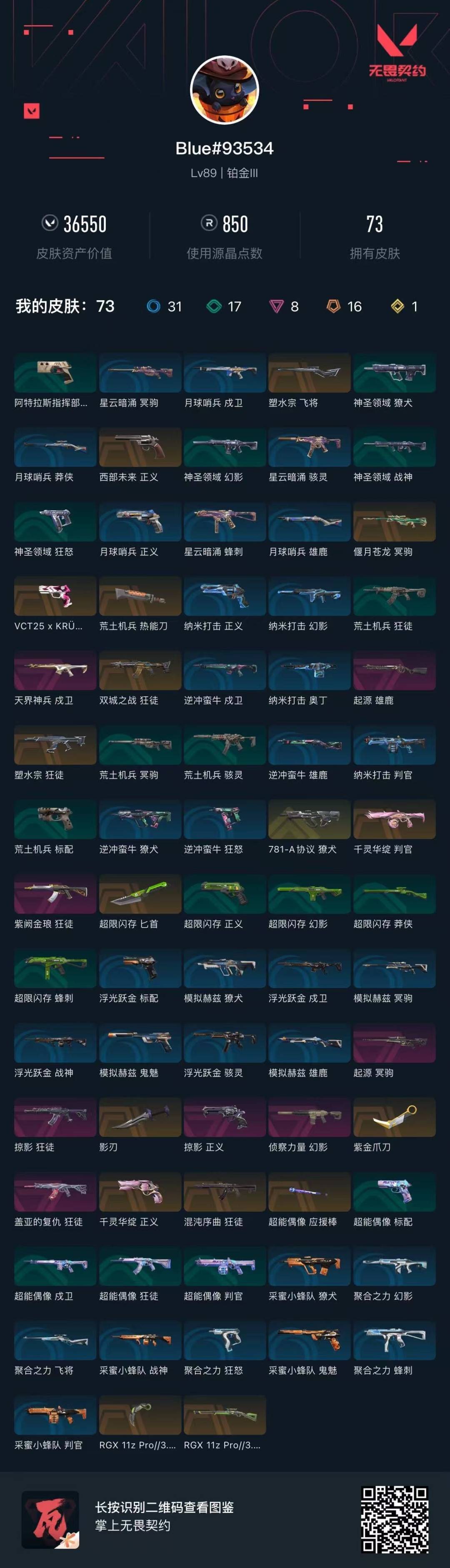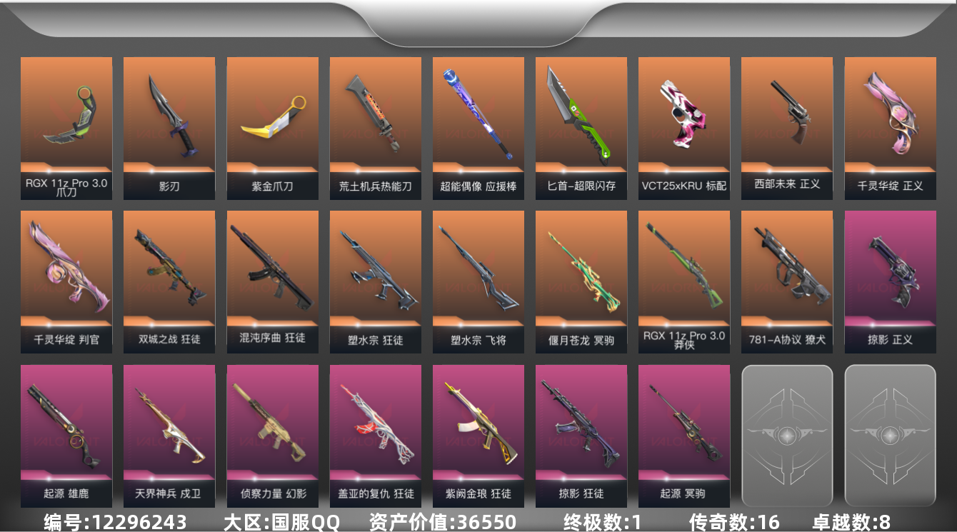 [12296243]16橙皮 1金皮 8紫皮 73皮肤 23英雄 100卡面 850已用源晶 铂金 优质装备:冥驹-偃月苍龙,狂徒-塑水宗,狂徒-混沌序曲,狂徒-掠影,狂徒-紫阙金琅,狂徒-盖亚的复仇,幻影-侦察力量,獠犬-781-A协议,正义-千灵华绽,正义-掠影,冥驹-起源,戍卫-天界神兵,紫金爪刀,飞将-塑水宗,判官-千灵华绽,爪刀-RGX 11z Pro 3.0,匕首-超限闪存,影刃,荒土机兵热能刀,雄鹿-起源 佩枪皮肤:标配-VCT25xKRU,正义-西部未来 步枪皮肤:狂徒-双城之战 狙击枪皮肤:莽侠-RGX 11z Pro 3.0 近战武器皮肤:超能偶像 应援棒