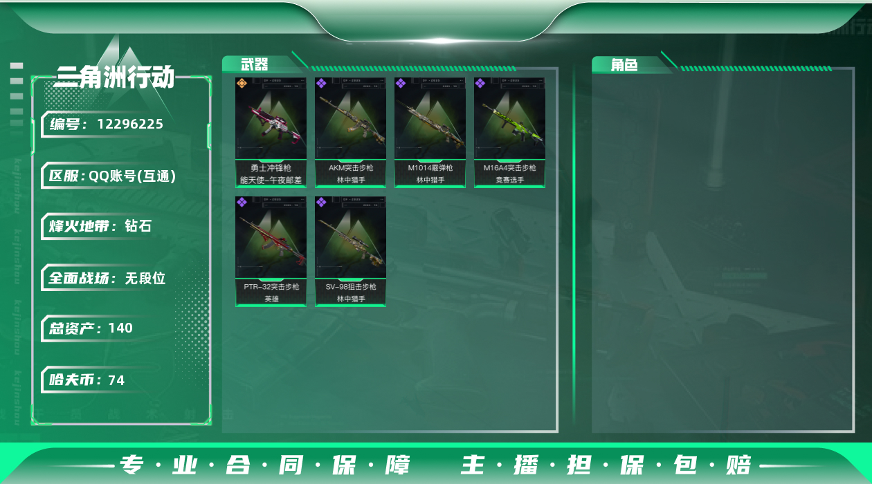 [12296225]总资产:140.9M 1传说枪械 哈夫币:74.286K 进阶安全箱(2×2)9.15号到期 可二次 可修改实名 烽火地带段位:钻石 全面战场段位:无段位 传说武器皮肤:勇士冲锋枪-能天使-午夜邮差 史诗武器皮肤:M16A4突击步枪-竞赛选手,AKM突击步枪-林中猎手,M1014霰弹枪-林中猎手,SV-98狙击步枪-林中猎手,PTR-32突击步枪-英雄