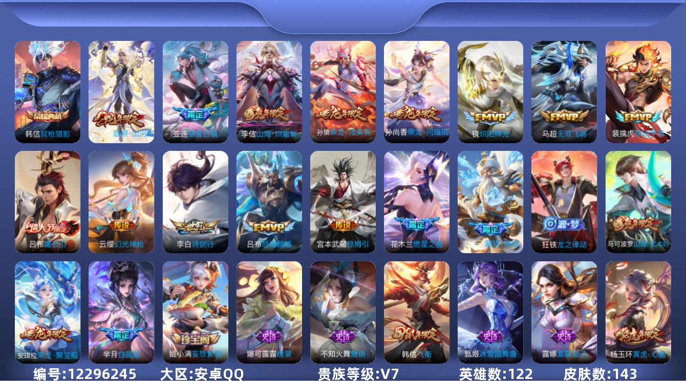 [12296245]V7 1典藏 14传说 122英雄 143皮肤 可修改实名 优质装备:弑枪猎影(韩信典藏),炽阳神光,无双飞将,山海·炽霜斩(李信年限),燃星之曲,惊梅引 传说皮:乘龙·问璇玑(孙尚香年限),乘龙·淬吴钩(孙策年限),吕布曦玄引,落雪白狼,祥瑞亨通,幻光神枪 珍宝阁皮:妄想食味 限定皮:愿照·山河定(司空震年限),白晶晶,飞衡(韩信年限),诗剑行,怒海麟威,五谷丰年,寅虎·心曲(虎婆),山海·玄木吟(马可年限) 史诗皮:龙之律动,藏狐·褐绒,乘龙·聚宝船(安琪拉年限),紫霞仙子,永昼,末日机甲-莱西奥,魅语,高渐离燃音魔法,蒙恬荣光圣徽,无限星赏官,青蛇,晚萤,百相守梦(关羽),乱世虎臣,节奏热浪,摇滚巨星,水果甜心,绅士熊喵,暗隐猎兽者,幽灵船长,乘风破浪,曙光守护者,金属风暴,圣诞恋歌,鹰眼统帅,魅力维加斯,黎明之约,雪上飞焰,无心