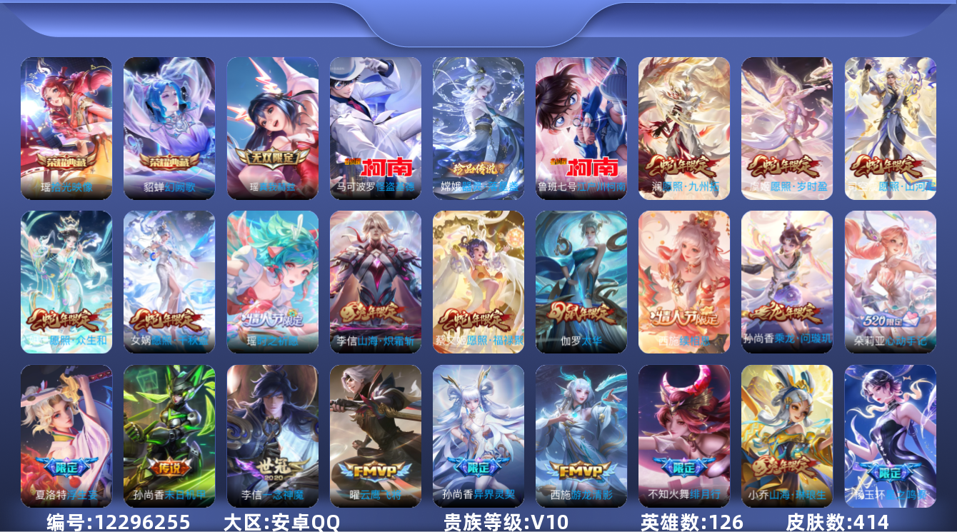 - [11899867]【商品标题】:安卓Q-V8-至尊星耀IV段位-126英雄-296皮肤-4典藏-0珍品无双-0无双-0珍品传说-2传说-80史诗 【荣耀典藏】:武则天英雄,孙悟空全息碎影,武则天倪克斯神谕,花木兰九霄神辉,关羽赤影疾锋 【传说皮肤】:桑启鸣野蒿,虞姬启明星使 【限定皮肤】:白起狰,蒙犽顽岩魄,蔡文姬夏日便利店,虞姬夏日便利店,姜子牙天穹之誓,杨戬破阵退雄兵,狄仁杰阴阳师,虞姬凯尔特女王,赵云皇家上将,妲己时之彼端,嬴政优雅恋人,孙尚香蔷薇恋人,庄周高山流水,高渐离玩趣恶龙,阿轲迷踪丽影,钟无艳超时空战士,芈月重明,夏侯惇朔风刀,甄姬游园惊梦,甄姬落雪兰心,曹操烛龙,典韦穷奇,马可波罗暗影游猎,狄仁杰魔术师,狄仁杰万华元夜,达摩沙漠行僧,项羽海滩派对,老夫子醍醐杖,程咬金演武夺筹,刘邦夺宝奇兵,兰陵王金庭之子,牛魔御旌,李元芳银河之约,李元芳云中旅人,虞姬启明星使,钟馗驱傩正仪,杨玉环遇见飞天,雅典娜单词大作战,雅典娜黎明之约,蔡文姬繁星吟游,太乙真人饕餮,鬼谷子原初探秘者,鬼谷子五谷丰年,苏烈千军破阵,百里玄策原初追逐者,弈星混沌棋,梦奇顽趣,沈梦溪大漠名商,明世隐疑决卦,裴擒虎李小龙,裴擒虎擒涛扼浪,狂铁御狮,米莱狄御霄,盾山御銮,猪八戒西部大镖客,猪八戒猪悟能,上官婉儿梁祝,嫦娥拒霜思,蒙犽狂想玩偶喵,鲁班大师探海日志,桑启海盐诗旅,艾琳流音漫舞,司空震地狱燃心,阿古朵江河有灵,张良古海寻踪,蒙恬荣光圣徽,高渐离燃音魔法,妲己灵卜魔法,鬼谷子天穹祈灯,伽罗琥珀纪元,沈梦溪龙舞盛年,鲁班七号蔬乡物语,李元芳蔬乡物语,刘邦剑破天穹,程咬金群星魔术团,镜青焰无极,项羽苍威无极,周瑜熔金海岸 【赛季限定】:白起狰,芈月重明,夏侯惇朔风刀,曹操烛龙,典韦穷奇,狄仁杰万华元夜,达摩沙漠行僧,老夫子醍醐杖,程咬金演武夺筹,兰陵王金庭之子,张良古海寻踪,牛魔御旌,李元芳云中旅人,虞姬凯尔特女王,钟馗驱傩正仪,雅典娜黎明之约,太乙真人饕餮,鬼谷子原初探秘者,苏烈千军破阵,百里玄策原初追逐者,弈星混沌棋,梦奇顽趣,沈梦溪大漠名商,明世隐疑决卦,裴擒虎擒涛扼浪,狂铁御狮,米莱狄御霄,盾山御銮,鲁班大师探海日志,桑启海盐诗旅,鬼谷子天穹祈灯,蒙恬荣光圣徽,刘邦剑破天穹,姜子牙天穹之誓 【战令限定】:蔡文姬夏日便利店,虞姬夏日便利店,阿轲迷踪丽影,钟无艳超时空战士,甄姬落雪兰心,马可波罗