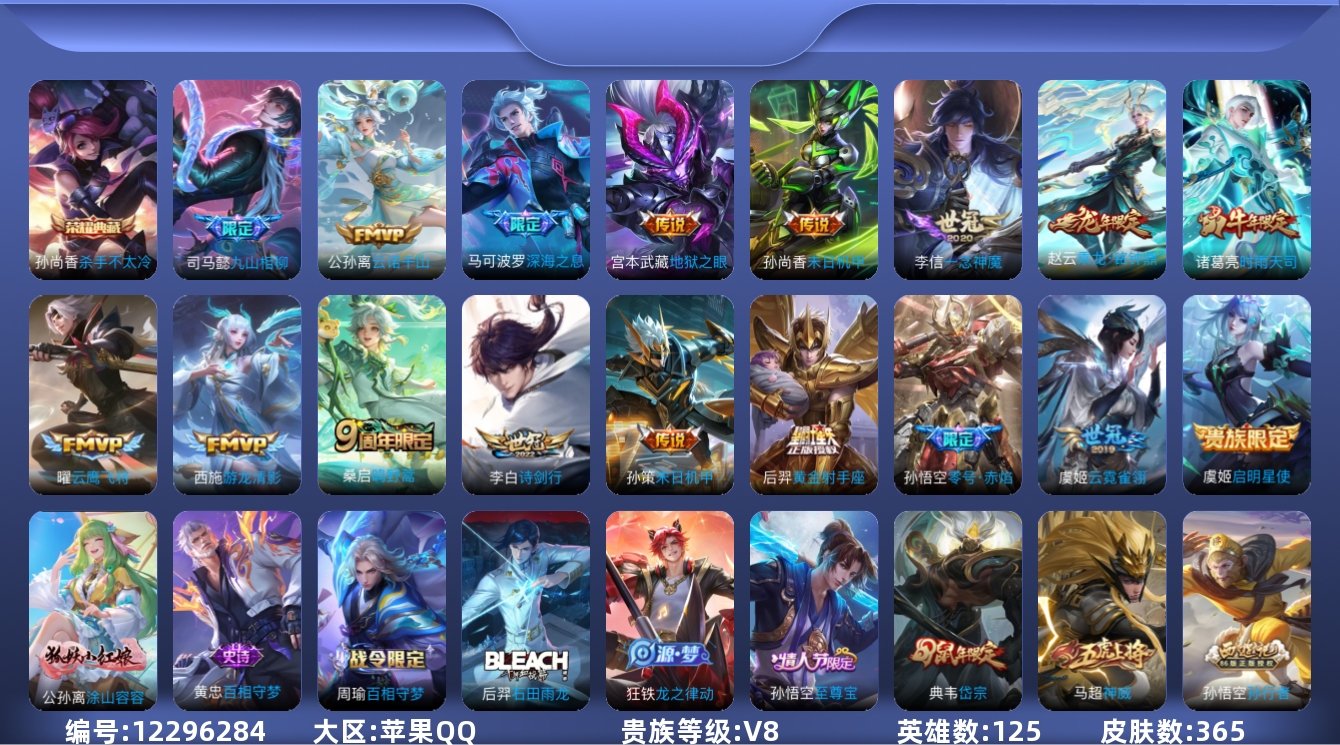 - [11881718]V7 1典藏 1珍品传说 9传说 125英雄 234皮肤 可修改实名 优质装备:鸣剑·曳影,黑崎一护,云鹰飞将(小将军),一念神魔,末日机甲-孙尚香(绿蚂蚱),地狱火,仲夏夜之梦(大飞蛾),遇见神鼓,澜逐花归海 传说皮:云诺千山 珍宝阁皮:妄想食味,优雅恋人 限定皮:逐霄战戟,鸣野蒿,至尊宝,遇见飞天,高山流水,匿光决锋者,五谷丰年,游园惊梦,梁祝,岱宗(典韦年限),李小龙 史诗皮:鸭鸭历险记-刘禅,化蝶舞,龙之律动,藏狐·褐绒,布丁狗之誓,茶境仙,谪仙醉月,决胜骁骑,超元猎域,炽弈燎原,百相守梦-黄忠,紫霞仙子,苍穹之光,黄金分割率,千年之狐,江河有灵,百解令(蒙犽),暗夜猫娘,魅语,无限星赏官,猫狗日记-大乔,乱世虎臣,节奏热浪,修罗,女仆咖啡,摇滚巨星,水果甜心,绅士熊喵,星夜王子,功夫厨神,德古拉伯爵,暗隐猎兽者,幽灵船长,鬼剑武藏,心灵战警,天秀·启明,舞动绿茵,纤云弄巧,繁星吟游(呼啦呼啦),拒霜思,乘风破浪,曙光守护者,金属风暴,圣诞狂欢,圣诞恋歌,鹰眼统帅,魅力维加斯,无心,未来纪元-赵云