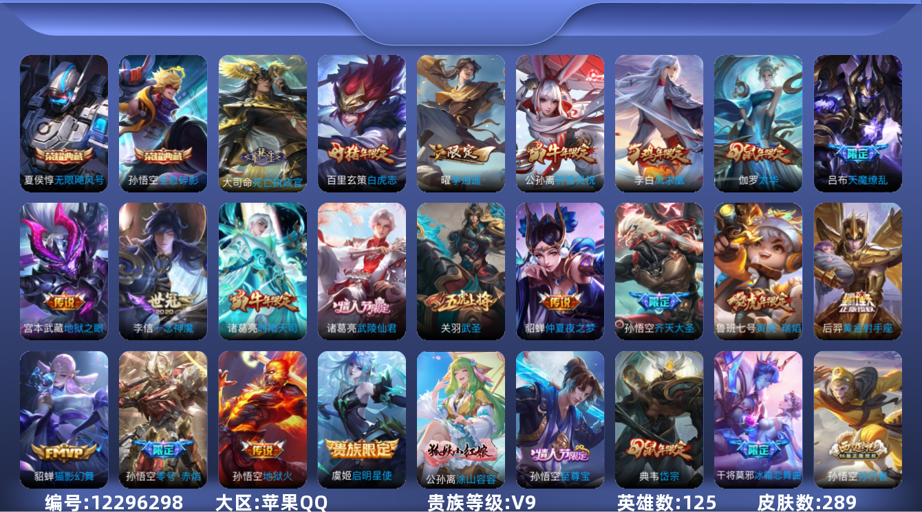 [12296298]V9 2典藏 20传说 125英雄 289皮肤 可修改实名 女号 优质装备:无限飓风号(高达),全息碎影(猴子典藏),黄金射手座,猫影幻舞,一念神魔,地狱火,仲夏夜之梦(大飞蛾),零号·赤焰,地狱之眼,李逍遥,涂山容容 传说皮:死亡执政官 珍宝阁皮:优雅恋人,蔷薇恋人 限定皮:至尊宝,白虎志(电光耗子),凤求凰(白切鸡),凤凰于飞,太华(伽罗年限),武陵仙君(小桃花),傲雪梅枪,白晶晶,时雨天司(水龙头),飞衡(韩信年限),遇见飞天,高山流水,齐天大圣,五谷丰年,青龙志(铠年限),冰锋战神,武圣,游园惊梦,梁祝,御风骁将(吕布年限),龙胆,逐梦之星,烈魂,岱宗(典韦年限),奔雷神使(牛魔年限),祈雪灵祝(雪兔子),天狼绘梦者,李小龙,逐梦之影,朱雀志(守约年限),辉光之辰,如梦令-嫦娥,如梦令-后羿,霸王别姬-项羽,霸王别姬-虞姬,圣诞老人,奇迹圣诞,真爱至上,纯白花嫁,孙行者,猪悟能,一生所爱,大圣娶亲,天魔缭乱,冰霜恋舞曲,蜜橘之夏,神奇女侠,美猴王,女儿国国王,寅虎·瑞焰(虎皮蛋子),玉兔公主,山海·玄木吟(马可年限) 史诗皮:苍穹之光,电玩小子(小书包),白龙吟,黄金分割率,千年之狐,龙骑士(小龙虾),冰冠公主,偶像歌手,暗夜猫娘,末日机甲-吕布,猫狗日记-孙策,时之恋人-孙尚香,乱世虎臣,女仆咖啡,摇滚巨星,水果甜心,绅士熊喵,天才门将,星夜王子,心灵骇客,功夫厨神,德古拉伯爵,暗隐猎兽者,幽灵船长,鬼剑武藏,心灵战警,地狱岩魂,纤云弄巧,繁星吟游(呼啦呼啦),缤纷独角兽,乘风破浪,逐浪之夏,水晶猎龙者,曙光守护者,金属风暴,原初追逐者,圣诞狂欢,圣诞恋歌,鹰眼统帅,王者之锤,魅力维加斯,雪上飞焰,无心,未来纪元-赵云