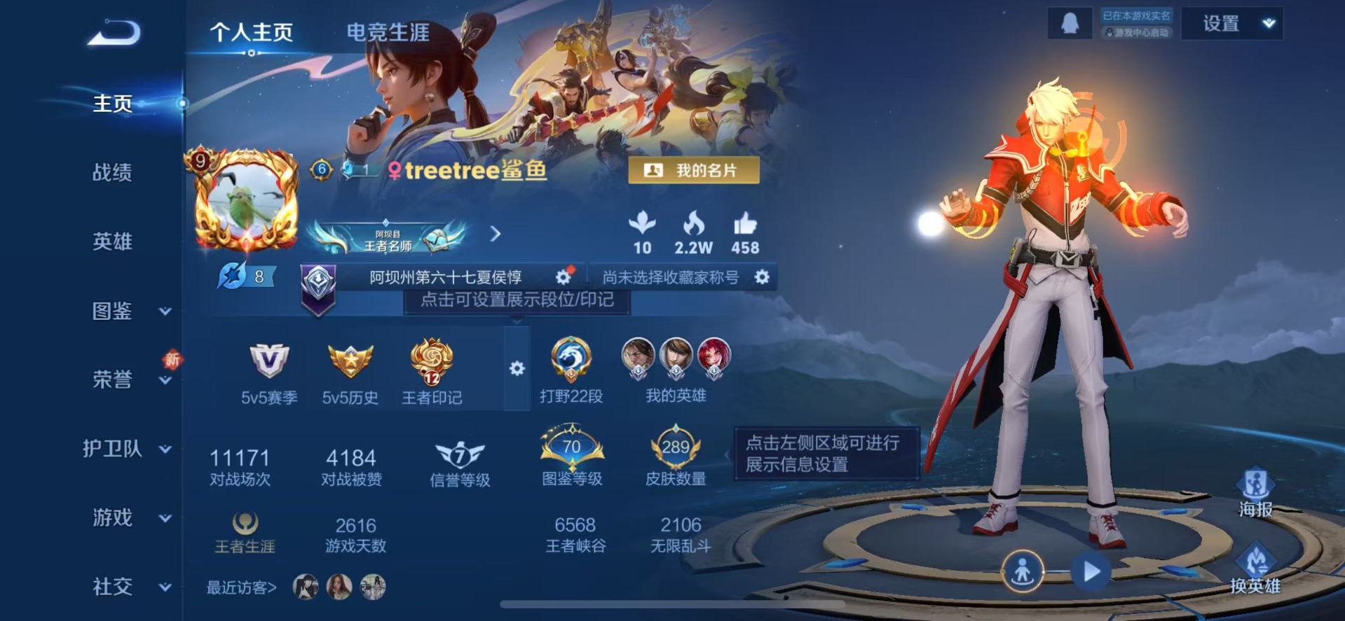 - PX_2057213-贵族等级: V5 英雄数: 47 皮肤数: 30 传说皮: 超时空战士-狄仁杰,云诺千山 限定皮: 鸣野蒿,愿照·山河定