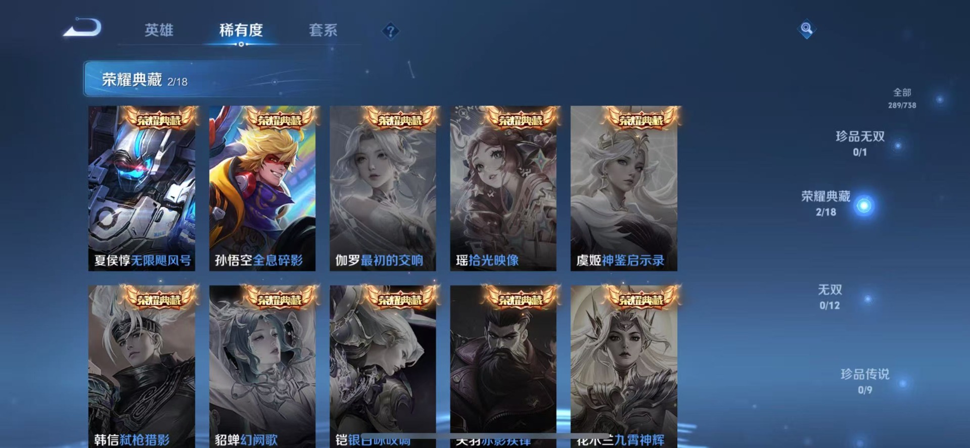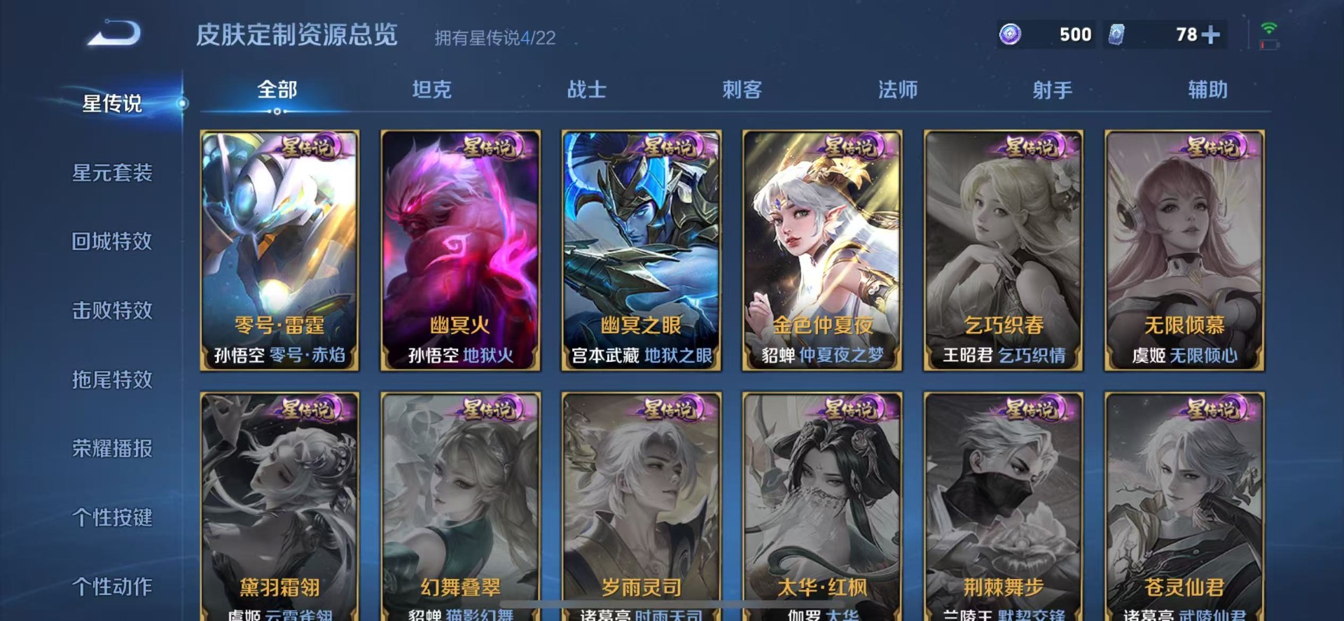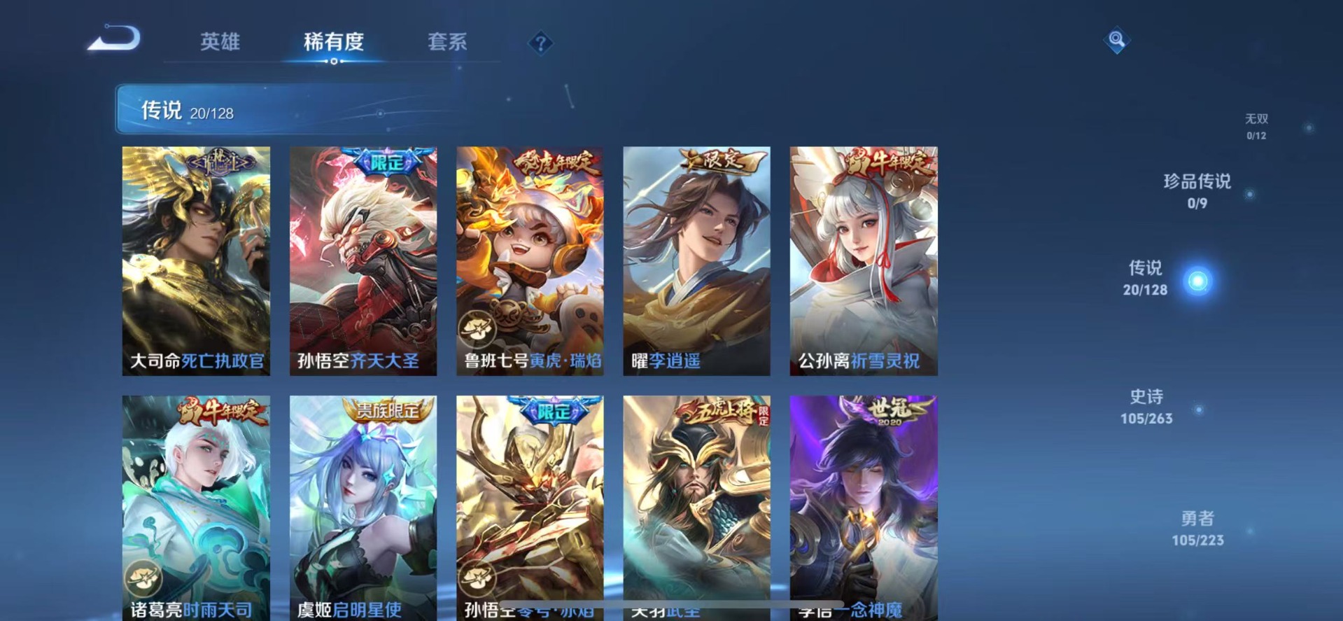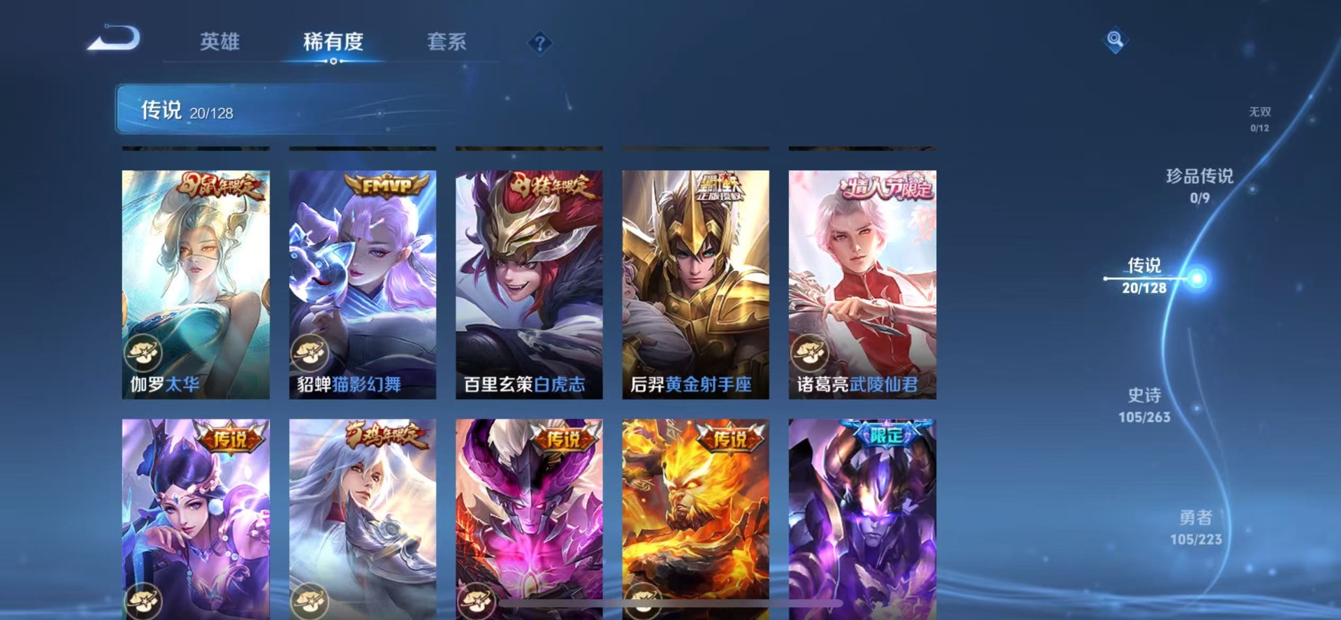 黄忠烈魂,老夫子圣诞老人,甄姬女儿国国王,铠青龙志,伽罗太华,赵云龙胆,干将莫邪冰霜恋舞曲,小乔纯白花嫁,典韦岱宗,牛魔奔雷神使,项羽霸王别姬,鲁班七号寅虎·瑞焰,吕布御风骁将,后羿如梦令,后羿辉光之辰,露娜一生所爱,周瑜真爱至上,诸葛亮时雨天司,公孙离祈雪灵祝,公孙离玉兔公主,公孙离蜜橘之夏,裴擒虎李小龙,上官婉儿梁祝,上官婉儿天狼绘梦者,马可波罗逐梦之星,马可波罗山海·玄木吟,猪八戒猪悟能,孙悟空孙行者,孙悟空大圣娶亲,芈月白晶晶,孙悟空至尊宝,孙悟空美猴王,百里玄策白虎志,雅典娜神奇女侠,韩信傲雪梅枪,韩信飞衡,韩信逐梦之影,百里守约朱雀志,蔡文姬奇迹圣诞,虞姬霸王别姬,嫦娥如梦令,王昭君凤凰于飞,关羽武圣,关羽冰锋战神