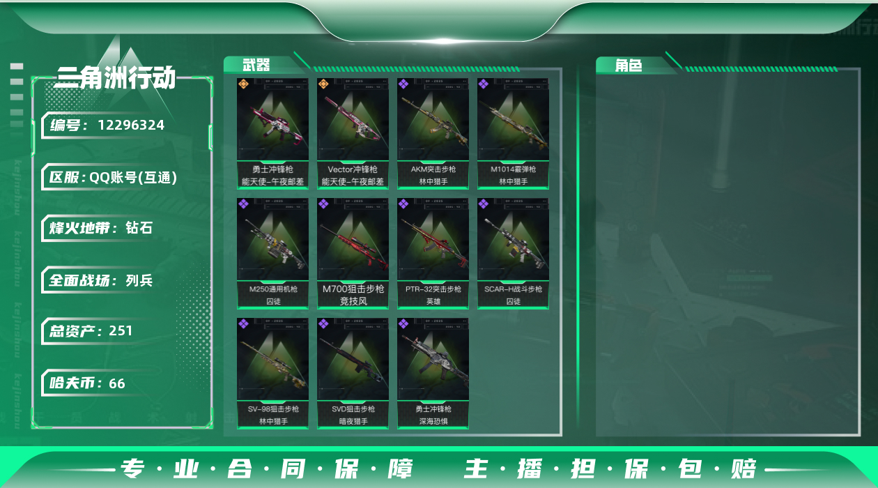 [12296324]总资产:251.1M 2传说枪械 哈夫币:66.811K 可二次 可修改实名 烽火地带段位:钻石 全面战场段位:列兵 传说武器皮肤:勇士冲锋枪-能天使-午夜邮差,Vector冲锋枪-能天使-午夜邮差 史诗武器皮肤:SVD狙击步枪-暗夜猎手,勇士冲锋枪-深海恐惧,AKM突击步枪-林中猎手,M1014霰弹枪-林中猎手,SV-98狙击步枪-林中猎手,PTR-32突击步枪-英雄,M250通用机枪-囚徒,SCAR-H战斗步枪-囚徒,M700狙击步枪-竞技风