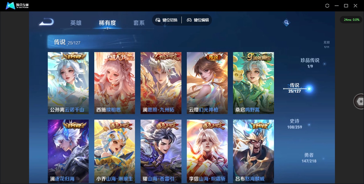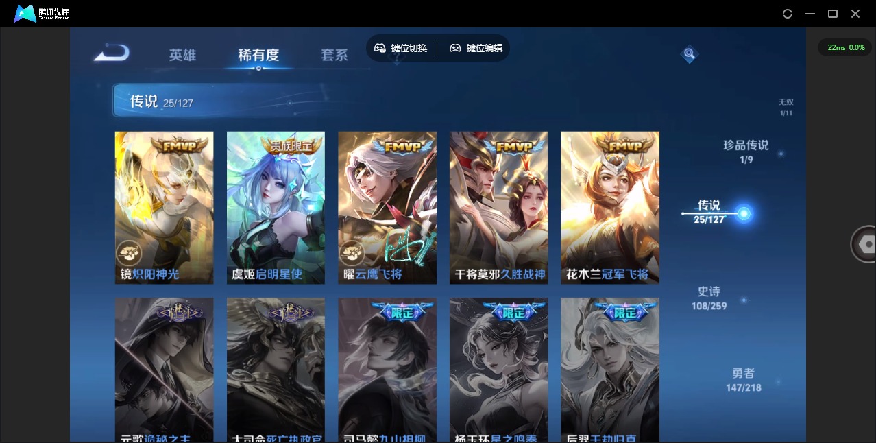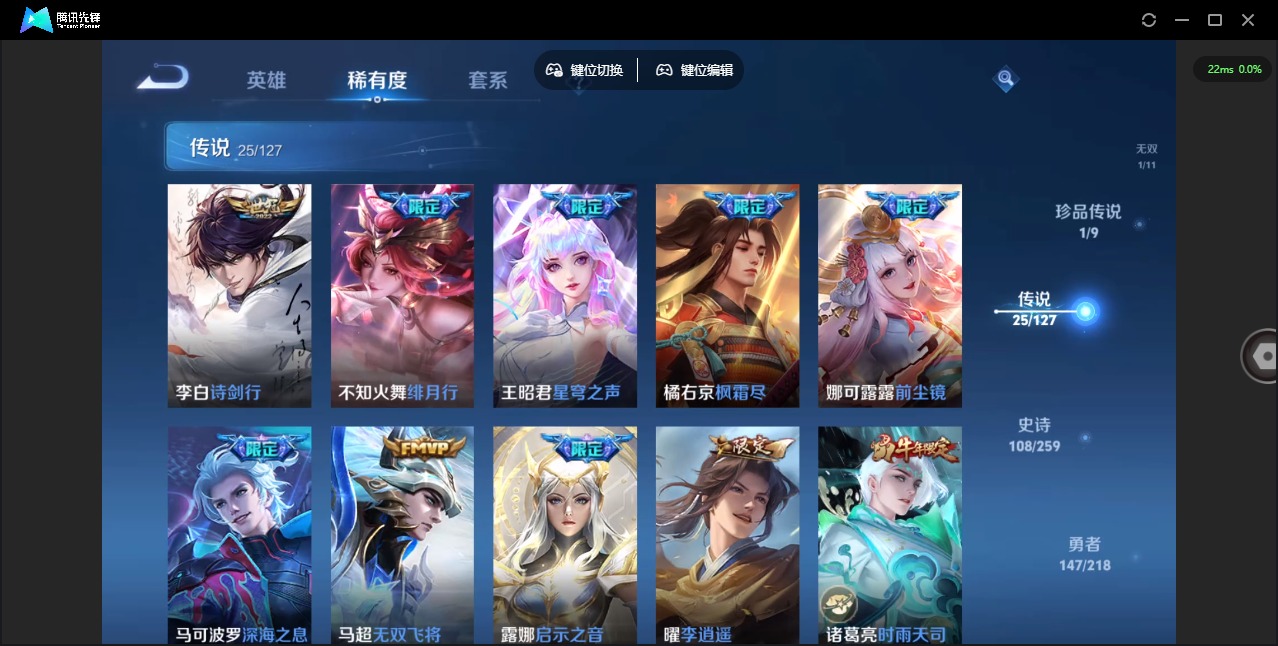 - [12201543]V6 1无双 4传说 114英雄 119皮肤 可修改实名 优质装备:器灵·螭龙剑,久胜战神,地狱火 珍宝阁皮:蔷薇恋人 限定皮:愿照·众生和(妲己年限),逐梦之音,祈雪灵祝(雪兔子),李小龙,猪悟能,引擎之心 史诗皮:器灵·浮梦炉,茶境仙,埋骨钱,蒙犽顽岩魄,决胜骁骑,苍穹之光,千年之狐,偶像歌手,暗夜猫娘,猫狗日记-大乔,水果甜心,德古拉伯爵,幽灵船长,鬼剑武藏,纤云弄巧,繁星吟游(呼啦呼啦),拒霜思,缤纷独角兽,乘风破浪,逐浪之夏,水晶猎龙者,鹰眼统帅,魅力维加斯,未来纪元-赵云
