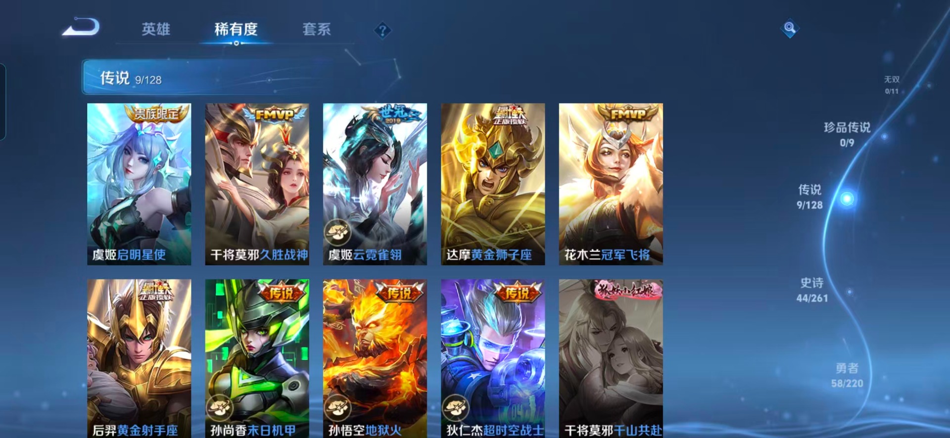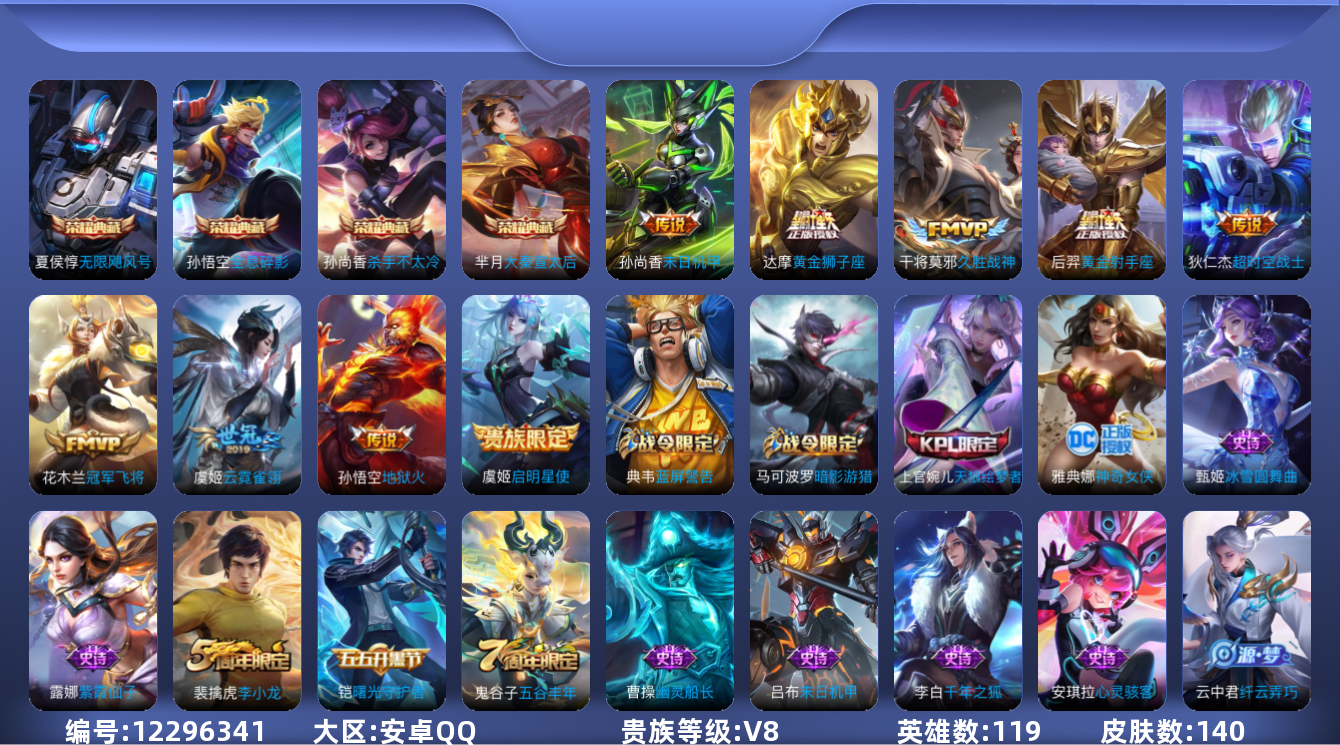 - [10957621]【商品标题】:安卓Q-V8-最强王者段位-125英雄-172皮肤-2典藏-0珍品无双-0无双-1珍品传说-17传说-49史诗 【荣耀典藏】:孙尚香杀手不太冷,铠银白咏叹调 【珍品传说】:安琪拉酷洛米之心 【内测皮肤】:狂铁特工战影 【传说皮肤】:宫本武藏地狱之眼,花木兰冠军飞将,达摩黄金狮子座,刘备时之恋人,虞姬启明星使,镜炽阳神光,赵云淬星耀世,吕布怒海麟威,小乔山海琳琅生,伽罗炽翼辉光,虞姬无限倾心,干将莫邪画中仙,澜逐花归海,马超琥珀纪元,孙策乘龙淬吴钩,貂蝉曦玄引,桑启鸣野蒿 【限定皮肤】:白起狰,狄仁杰阴阳师,虞姬凯尔特女王,小乔山海琳琅生,赵云皇家上将,庄周高山流水,扁鹊奇幻香踪,芈月白晶晶,夏侯惇朔风刀,典韦穷奇,马可波罗山海玄木吟,狄仁杰魔术师,项羽海滩派对,老夫子醍醐杖,牛魔御旌,牛魔奔雷神使,李元芳云中旅人,虞姬启明星使,虞姬无限倾心,钟馗驱傩正仪,杨戬潮玩骑兵,干将莫邪画中仙,雅典娜单词大作战,太乙真人饕餮,鬼谷子原初探秘者,鬼谷子五谷丰年,苏烈千军破阵,百里守约朱雀志,弈星混沌棋,梦奇顽趣,公孙离玉兔公主,沈梦溪大漠名商,沈梦溪匿光破解者,明世隐疑决卦,裴擒虎擒涛扼浪,狂铁御狮,米莱狄御霄,瑶山海碧波行,伽罗炽翼辉光,上官婉儿梁祝,嫦娥暖冬兔眠,西施至美乘鲤谣,桑启海盐诗旅,暃星界游侠,艾琳流音漫舞,司空震地狱燃心,阿古朵江河有灵,张良古海寻踪,蒙犽百解令,蒙恬荣光圣徽,鬼谷子天穹祈灯,马超琥珀纪元,姬小满妄想食味,孙策乘龙淬吴钩,貂蝉曦玄引,刘邦剑破天穹 【年限皮肤】:百里守约朱雀志,牛魔奔雷神使,瑶山海碧波行,马可波罗山海玄木吟,小乔山海琳琅生,伽罗炽翼辉光,孙策乘龙淬吴钩 【赛季限定】:白起狰,夏侯惇朔风刀,典韦穷奇,老夫子醍醐杖,张良古海寻踪,牛魔御旌,李元芳云中旅人,虞姬凯尔特女王,钟馗驱傩正仪,太乙真人饕餮,鬼谷子原初探秘者,苏烈千军破阵,弈星混沌棋,梦奇顽趣,沈梦溪大漠名商,明世隐疑决卦,裴擒虎擒涛扼浪,狂铁御狮,米莱狄御霄,桑启海盐诗旅,鬼谷子天穹祈灯,蒙恬荣光圣徽,刘邦剑破天穹 【战令限定】:扁鹊奇幻香踪,艾琳流音漫舞,杨戬潮玩骑兵,雅典娜单词大作战,嫦娥暖冬兔眠,司空震地狱燃心,暃星界游侠 【史诗皮肤】:鲁班七号电玩小子,项羽苍穹之光,赵云皇家上将,甄姬冰雪圆舞曲,王昭君偶像歌手,狄仁杰魔术师,廉颇地狱岩魂,孙尚香水果甜