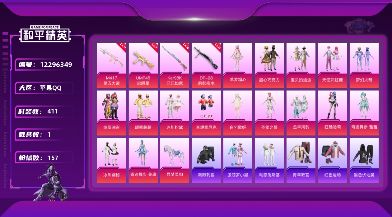[12296349]16粉装 4特效枪 1载具 9印记 可二次 可修改实名 优质装备:晶梦灵驹,甜心巧克力,梦幻火箭(新101)(新火箭少女101粉色套装),宝贝奶油派,天使彩虹糖,缤纷油彩(猪妹猪脸妹),UMP45启明星,M417第五大道,七级M417-第五大道,七级UMP45-启明星,狂魅哈莉,奇迹舞步-雅雅,奇迹舞步-美琪,羊梦糖心,Kar98K-巳巳如意 热门装扮:暖熊萌萌,冰川粉黛,冰川幽秘,音爆索尼克,白勺歌姬,圣堂之誓,金丰海韵,动感兔斯基,激萌罗小黑,鹰眼刺客 稀有枪皮:DP-28-豹影疾电 五级特效枪:五级Kar98K-巳巳如意 四级特效枪:四级DP-28-豹影疾电 紫色装扮:SS23特训,SS31特训套装,SS33特训套装,SS21特训,熠彩粉晶,苍岚星,照水倚天,田园牧歌,轻风白浪,和煦暖阳,SS22特训,莱茵河畔,香榭午后,吉莉礼服,夏日倾情,幻世战舞者,萌趣咩咩,灵公主,灵幻魔术师,娇憨猪猪,天籁歌者,SS20特训,甜心亚梦,虚音幻奏,粉团憨憨,梦幻奶油,酸甜橘柚,樱桃黑巧,软羊咩咩,英勇保护者,青年教官,飞行日记,魅力单车,麻辣教官,黎明保卫者,黑色伏地魔,龙的传人,龙魂突击队,酷潮明星,长空猛禽,清新柠檬,湖蓝色名流,牛气满满,探宝勇士,极地朋克,水手小飞鸭,竞技达人朋克,红色运动,绮丽涂鸦,绵云熊熊,缤纷果语,蓝彩潮人,狂沙舞者,猛禽,空岛之星,破晓战魂,破蛋小黄鸡,短笛,SS29特训,奶油梦幻熊,热情海星,鱼渊荷华,玉兔迎春,燕燕于飞,巳巳如意,红潮炫舞,智谋强哥,小狗蛇点点,晶辉守护,晶灵使者,竞技名士,摩登魅猫,红熊茄茄,纯真浪花,惊鸿侠骨,粉红小猪,SS24特训(SS24特训套装),SS25特训,锦衣飞扬,菲菲,傲娇队长,童真绒兔,Alan Walker,浪漫天命,SS26特训,春光漫游,快闪甜心,玲珑飞花,格斗专家,耀粉歌者,大橘大利,SS32特训服(SS32特训套装),瑰梦爱神,绯格组合,雪夜云雾,光之冒险,初雨海棠 优质战备:奇迹舞步降落伞,精灵梦叶罗丽降落伞,公主华盖飞行器,深渊漩涡飞行器,宇宙意志降落伞,莲影清波降落伞,千金淑猫降落伞,镜域双华-灵镜之阶,蜜语绒猫降落伞,沙丘之主降落伞,晶梦幻蝶降落伞,旋转彩虹降落伞,歌者泠鸢飞行器,暖熊萌萌降落伞,环太平洋降落伞,未来战士降落伞,甜心宝贝降落伞,春暖花开降落伞,梦幻火箭降落伞,梦幻
