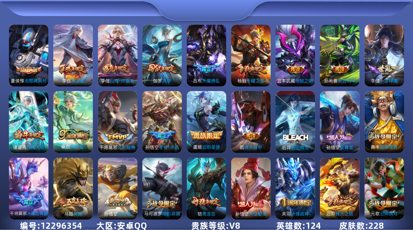 - [11605382]V7 1典藏 6传说 125英雄 332皮肤 可修改实名 女号 优质装备:全息碎影(猴子典藏),地狱火,胖达荣荣 传说皮:乘龙·铭钟鼎(赵云年限),幻光神枪 珍宝阁皮:优雅恋人,蔷薇恋人,女武神 限定皮:愿照·九州拓(澜年限),逐霄战戟,鸣野蒿,飞衡(韩信年限),遇见飞天,高山流水,五谷丰年,梁祝,御风骁将(吕布年限),天狼征服者,李小龙,孙行者,猪悟能,引擎之心,冰霜恋舞曲,百木心枪,玉兔公主 史诗皮:化蝶舞,龙之律动,石田雨龙,谪仙醉月,决胜骁骑,蔬乡物语(鲁班七号),百相守梦-黄忠,紫霞仙子,电玩小子(小书包),白龙吟,黄金分割率,特工魅影,千年之狐,电玩·爆裂旋风,江河有灵,百解令(蒙犽),高渐离燃音魔法,晚萤,末日机甲-吕布,猫狗日记-孙策,猫狗日记-大乔,时之恋人-孙尚香,节奏热浪,修罗,女仆咖啡,摇滚巨星,水果甜心,绅士熊喵,星夜王子,心灵骇客,德古拉伯爵,暗隐猎兽者,幽灵船长,鬼剑武藏,暗渊魔法,心灵战警,天秀·启明,舞动绿茵,地狱岩魂,纤云弄巧,繁星吟游(呼啦呼啦),拒霜思,缤纷独角兽,乘风破浪,逐浪之夏,水晶猎龙者,曙光守护者,热力回旋,金属风暴,圣诞狂欢,圣诞恋歌,鹰眼统帅,暗夜贵公子,无心,未来纪元-赵云