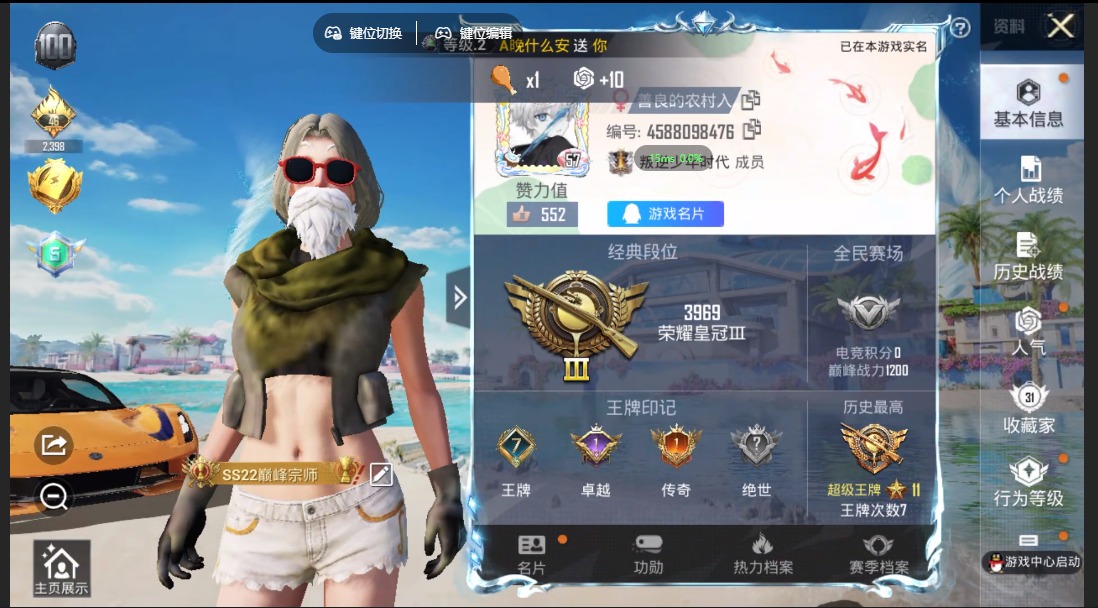 - PX_2094388- 可二次 V8 贵族积分56597 安卓QQ/270皮肤/125英雄/3典藏/0珍品无双/1无双/3珍品传说/15传说/87史诗/9稀有英雄 对抗路39段 打野45段 发育路30段 历史(省标 澜) 【3 典藏皮肤】,鸣剑·曳影 李白,全息碎影 孙悟空,星域神启 诸葛亮, 【1 无双皮肤】,群星魔术团 韩信, 【15 传说皮肤】,枫霜尽 橘右京,启明星使 虞姬,碎云 百里