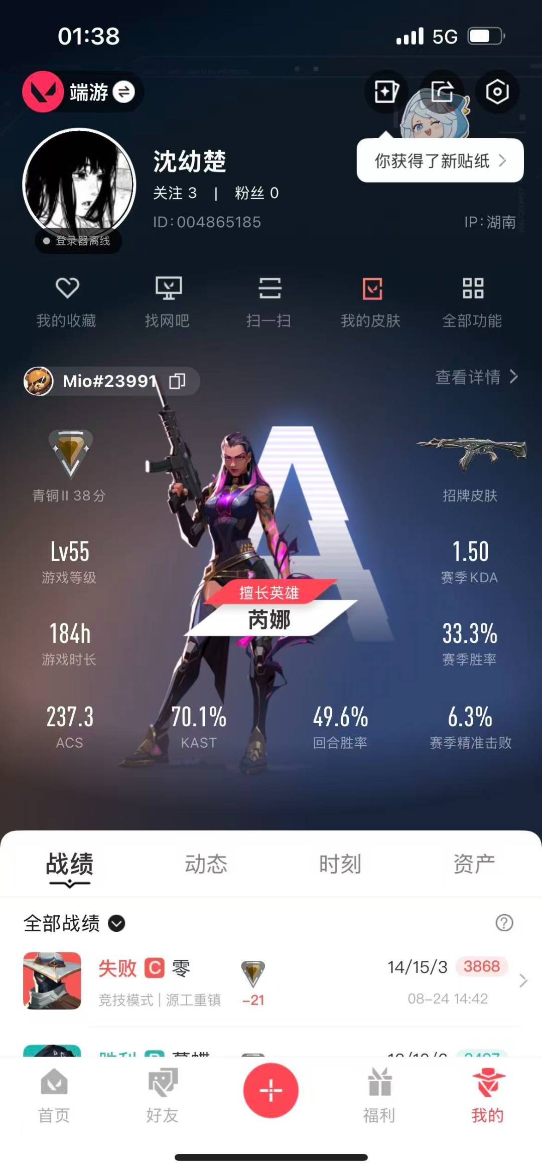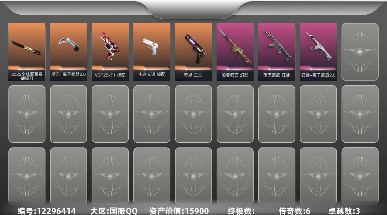 [12296414]6橙皮 3紫皮 22皮肤 20英雄 55卡面 395已用源晶 青铜 优质装备:正义-奇点,幻影-般若假面,离子武器2.0 爪刀 亮点皮肤:2022全球冠军赛 蝴蝶刀 佩枪皮肤:标配-电音光谱,标配-VCT25xT1 步枪皮肤:狂徒-离子武器2.0,狂徒-堕天遗武