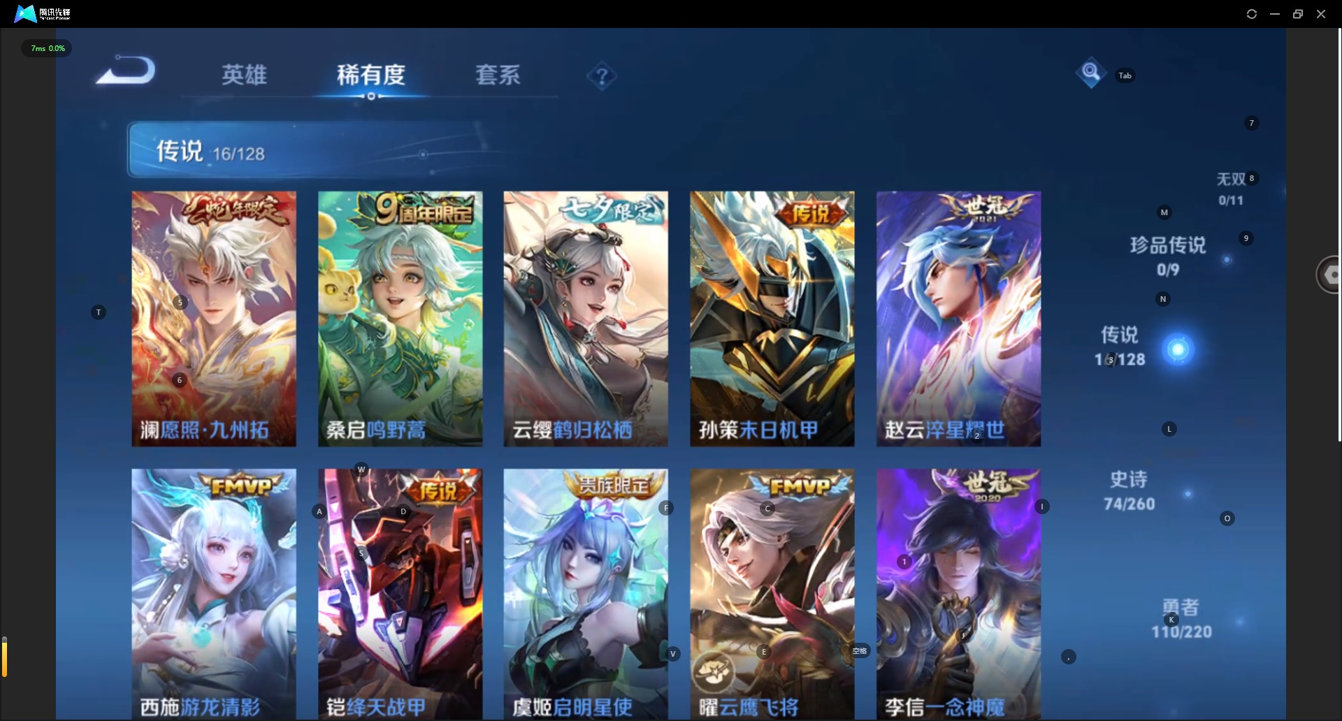 - [11910039]V6 3传说 123英雄 262皮肤 可修改实名 优质装备:涂山容容 传说皮:幻光神枪 珍宝阁皮:胡桃夹子,万物之道,蔷薇恋人 限定皮:愿照·山河定(司空震年限),鸣野蒿,五谷丰年,梁祝,李小龙,辉光之辰,猪悟能,大圣娶亲 史诗皮:鸭鸭历险记-刘禅,化蝶舞,星界战将,谪仙醉月,龙之律动,石田雨龙,百相守梦-周瑜,茶境仙,怒海争锋,破空之剑,琥珀纪元伽罗,蔬乡物语(鲁班七号),百相守梦-黄忠,紫霞仙子,苍穹之光,黄金分割率,特工魅影,千年之狐,江河有灵,雪夜绮愿(周瑜),蒙恬荣光圣徽,冰冠公主,白蛇,晚萤,电玩·爆裂旋风,末日机甲-吕布,猫狗日记-孙策,猫狗日记-大乔,乱世虎臣,节奏热浪,女仆咖啡,水果甜心,绅士熊喵,天才门将,星夜王子,心灵骇客,功夫厨神,德古拉伯爵,暗隐猎兽者,幽灵船长,鬼剑武藏,心灵战警,乐园奇幻夜,天秀·启明,舞动绿茵,地狱岩魂,纤云弄巧,繁星吟游(呼啦呼啦),拒霜思,缤纷独角兽,乘风破浪,逐浪之夏,水晶猎龙者,曙光守护者,金属风暴,原初追逐者,圣诞狂欢,圣诞恋歌,鹰眼统帅,黎明之约,赏金猎手,无心,未来纪元-赵云