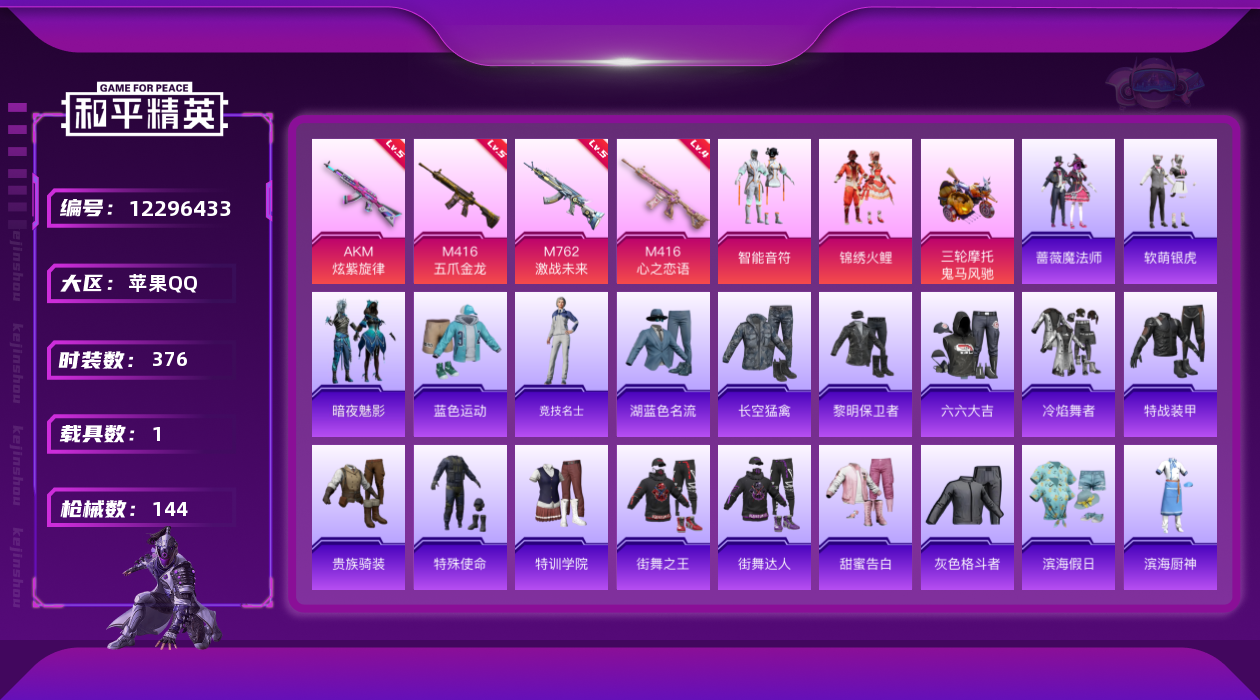 [12296433]2粉装 4特效枪 1载具 10印记 可二次 可修改实名 优质装备:AKM炫紫旋律,M416五爪金龙,M416心之恋语,智能音符,M762激战未来,锦绣火鲤 热门装扮:软萌银虎,蔷薇魔法师,暗夜魅影 载具:鬼马风驰 五级特效枪:五级M762-激战未来,五级Kar98K-伏魔团,五级M416-五爪金龙 四级特效枪:四级M416-心之恋语 紫色装扮:SS22特训,SS21特训,六六大吉,冰川特警,冷焰舞者,SS20特训,青春冒险家,潮流游乐家,SS15特训,鹤发童颜,时空追击者,暴风机械师,SS16特训,快乐星愿,银白舞王,SS13特训,治愈之星,迅捷之星,科技之星,SS14特训,萌趣颜团子,特种颜团子,飞驰魅影,音速流光,SS19特训,吉莉礼服,雪兔飞飞,瑞龙福将,团圆交子,SS17特训,SS18特训,都市漫游者,长空猛禽,耀眼新星,蓝色运动,虎虎生威吉莉,飞行日记,魅力单车,黎明保卫者,朋克治安官,极速红龙,格斗先锋,滨海假日,夏日音浪,幻世战舞者,怒火燎原,湖蓝色名流,滨海厨神,白熊同盟,破晓战魂,神秘领域,甜蜜告白,福星高照,牛气冲天,灰色格斗者,炫蓝之夏,热血青春,牛气满满,特战装甲,特殊使命,特训学院,狂沙舞者,镭射皇者,竞技名士,SS24特训(SS24特训套装),金羽特工,萌主吾皇,摇滚狂鲨,迷域探索者,玲珑飞花,SS8特训,丝绸行者,神秘舞者,粉甜马卡龙,白虎圣者,原初圣火,逆风勇士,SS12特训,韶华初心,辉星之火,纯白誓言,众神之王,智慧之神,SS9特训,舞夜骑士,风华少年志,SS10特训,暗夜契约,机械英豪,机械征服者,SS11特训,萌黄之夏,金耀舞者,蓝调潮人,贵族骑装,街舞达人,街舞之王,海上生明月 优质战备:炫紫旋律降落伞,繁花小夜曲降落伞,飞行器-心之恋语(心之恋语飞行翼),扶摇飞仙降落伞,潮汐统领降落伞,阿狸红降落伞,心之恋语降落伞,香水柠檬降落伞