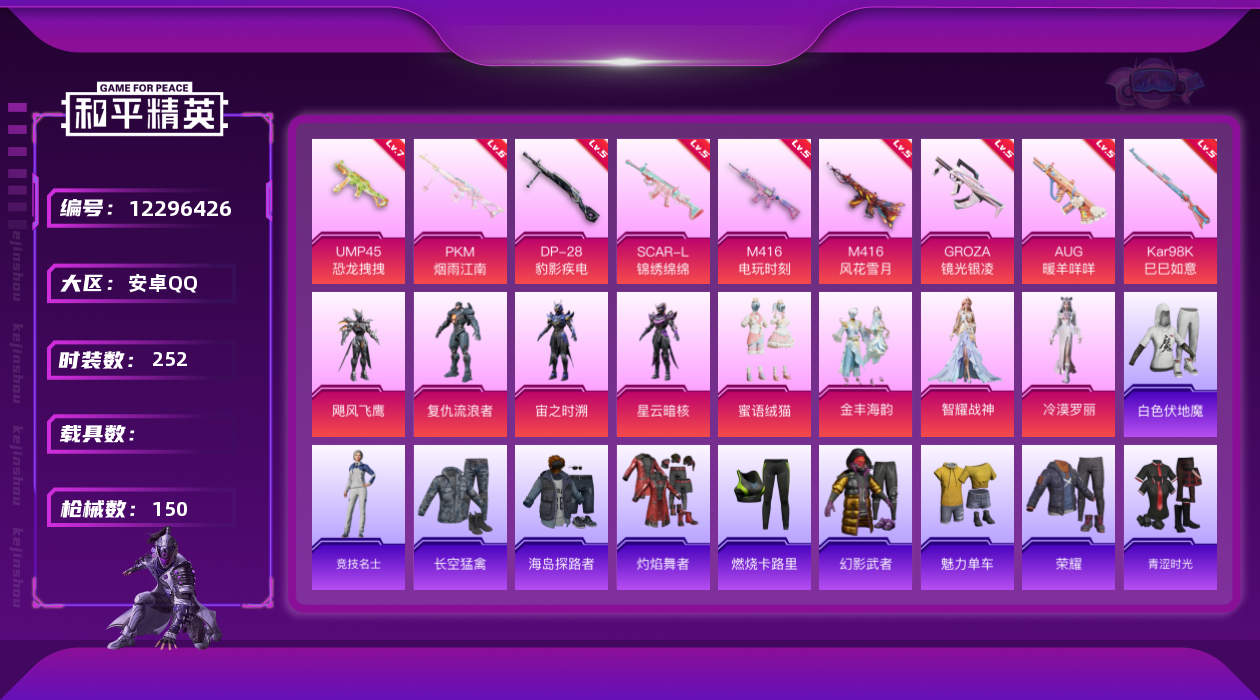 - PX_1984728- QQ钱包无法注销 安卓手Q-14王牌印记-3粉装-4特效枪-1载具-56010热力值-156套装-202枪皮-1卓越印记-0传奇印记 【3粉装】,星穹咏叹调,炫光之旅,萨利娅 【4特效枪】AKM-绿萝繁花-5级 M416-电玩时刻-5级 AUG-暖羊咩咩-5级 Kar98K-巳巳如意-5级 【2稀有紫装】,浪漫天命,龟仙人, 【1稀有载具】,俏皮小熊猫, 【156稀有时