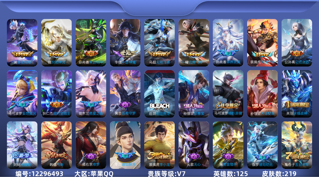 [12296493]V7 12传说 125英雄 219皮肤 可修改实名 优质装备:云鹰飞将(小将军),炽阳神光,一念神魔,末日机甲-孙尚香(绿蚂蚱),超时空战士-狄仁杰,无双飞将,燃星之曲,记忆之芯(机甲兔),妄想实况,澜逐花归海 传说皮:祥瑞亨通 珍宝阁皮:胡桃夹子,蔷薇恋人 限定皮:逐霄战戟,至尊宝,异界灵契(白毛香),飞衡(韩信年限),遇见飞天,五谷丰年,冰锋战神,李小龙,大圣娶亲 史诗皮:化蝶舞,星界战将,谪仙醉月,石田雨龙,琥珀纪元伽罗,百相守梦-百里守约,星界特工,百相守梦-黄忠,黄金分割率,特工魅影,千年之狐,蒙恬荣光圣徽,偶像歌手,猫狗日记-孙策,乱世虎臣,节奏热浪,修罗,摇滚巨星,水果甜心,德古拉伯爵,暗隐猎兽者,鬼剑武藏,天秀·启明,纤云弄巧,乘风破浪,月团寄思,水晶猎龙者,唤灵魅影,金属风暴,原初追逐者,圣诞狂欢,鹰眼统帅,魅力维加斯,黎明之约,赏金猎手,无心,未来纪元-赵云