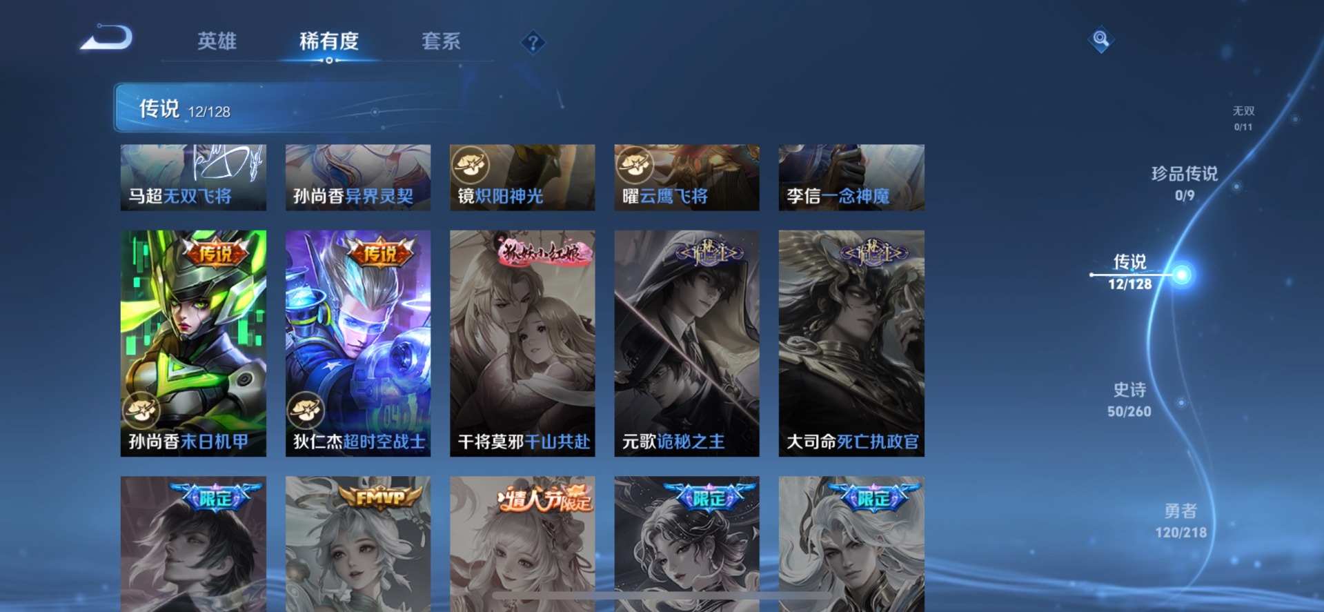 - [12228799]V8 1典藏 1无双 2珍品传说 14传说 124英雄 292皮肤 可修改实名 优质装备:杀手不太冷,器灵·螭龙剑,朽木白哉,黑崎一护,黄金射手座,云鹰飞将(小将军),末日机甲-孙尚香(绿蚂蚱),地狱火,音你心动-小乔,零号·赤焰,记忆之芯(机甲兔),涂山容容 传说皮:云诺千山,幻光神枪 珍宝阁皮:优雅恋人 限定皮:愿照·九州拓(澜年限),愿照·岁时盈(虞姬年限),至尊宝,白虎志(电光耗子),凤凰于飞,白鹤梁神女,遇见飞天,高山流水,诗剑行,梁祝,天狼溯光者,李小龙,朱雀志(守约年限),猪悟能,大圣娶亲 史诗皮:鸭鸭历险记-刘禅,器灵·浮梦炉,狼魂孤将,化蝶舞,龙之律动,石田雨龙,百相守梦-周瑜,茶境仙,白龙吟,黄金分割率,特工魅影,千年之狐,蒙恬荣光圣徽,冰冠公主,青蛇,晚萤,末日机甲-吕布,猫狗日记-孙策,猫狗日记-大乔,乱世虎臣,节奏热浪,修罗,女仆咖啡,摇滚巨星,水果甜心,星夜王子,功夫厨神,暗隐猎兽者,幽灵船长,鬼剑武藏,乐园奇幻夜,地狱岩魂,纤云弄巧,繁星吟游(呼啦呼啦),乘风破浪,逐浪之夏,曙光守护者,金属风暴,原初追逐者,圣诞狂欢,圣诞恋歌,鹰眼统帅,魅力维加斯,黎明之约