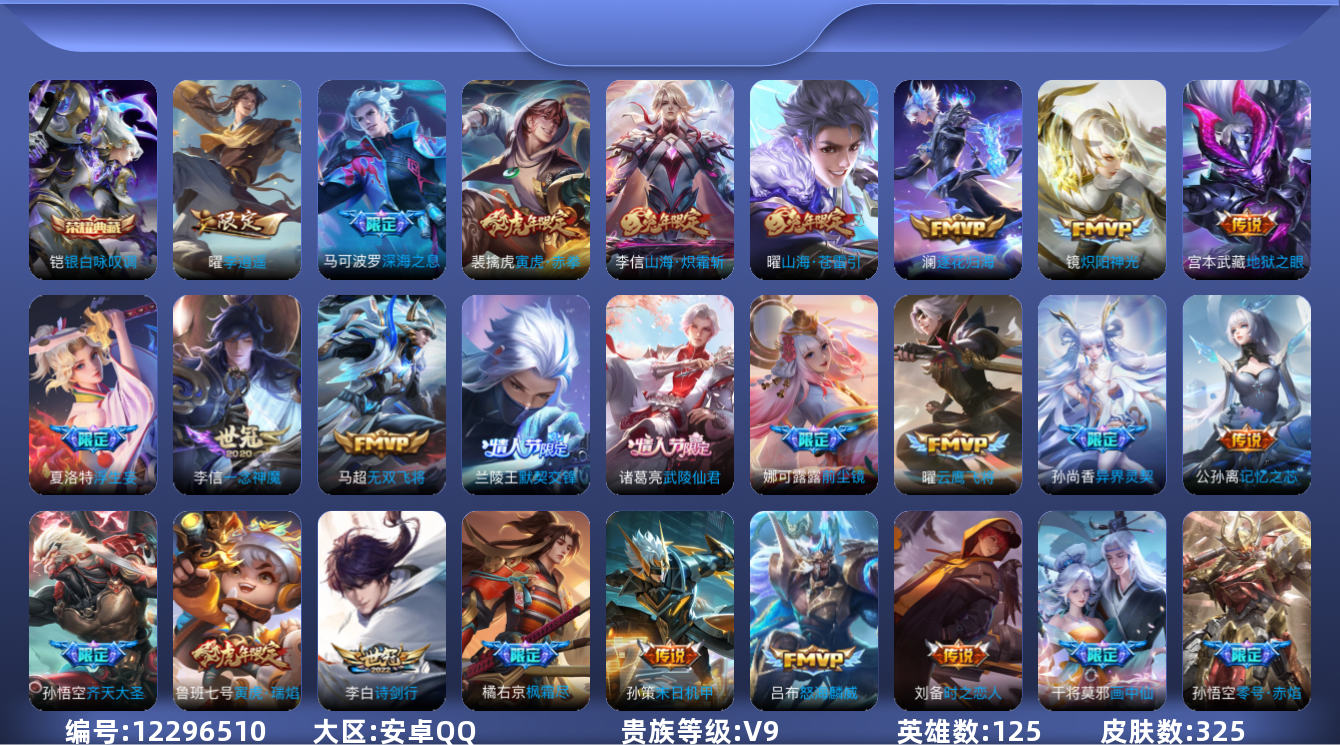 [12296510]V9 1典藏 42传说 125英雄 325皮肤 可修改实名 优质装备:银白咏叹调(倪克斯侍卫),云鹰飞将(小将军),绛天战甲(鸡嘴战神),炽阳神光,一念神魔,云霓雀翎,地狱火,零号·赤焰,地狱之眼,飞鸢探春,李逍遥,时之恋人-刘备(电焊工),淬星耀世,末日机甲-孙策,挚爱之约,无双飞将,碎云,山海·炽霜斩(李信年限),山海·苍雷引(电光曜子),炽翼辉光(娃娃菜牛角包),燃星之曲,画中仙,浮生妄,记忆之芯(机甲兔),百相守梦(张飞),电玩·雷克斯,澜逐花归海 珍宝阁皮:优雅恋人,玩趣恶龙 限定皮:至尊宝,凤凰于飞,武陵仙君(小桃花),异界灵契(白毛香),傲雪梅枪,寅虎·展翼(孙膑年限),前尘镜,无限倾心-项羽,瑞麟志(木兰年限),诗剑行,无限倾心-虞姬,齐天大圣,匿光决锋者,怒海麟威,五谷丰年,青龙志(铠年限),梁祝,龙胆,天狼绘梦者,李小龙,玄武志(苏烈年限),朱雀志(守约年限),默契交锋-兰陵王,孙行者,猪悟能,匿光追影者,寅虎·御盾(廉颇年限),寅虎·瑞焰(虎皮蛋子),寅虎·心曲(虎婆),寅虎·赤拳(老虎年限),时之祈愿-云中君,百木心枪,启示之音,无尽星芒,深海之息(深海大菠萝),枫霜尽,山海·玄木吟(马可年限) 史诗皮:龙之律动,石田雨龙,怒海争锋,蔬乡物语(鲁班七号),百相守梦-黄忠,遇见神鹿,紫霞仙子,白龙吟,黄金分割率,千年之狐,永昼,江河有灵,匿光侦查者,真我赫兹(百里守约),魅语,百解令(蒙犽),高渐离燃音魔法,蒙恬荣光圣徽,无限星赏官,匿光破解者,偶像歌手,电玩·爆裂旋风,百相守梦(刘备),暗夜猫娘,百相守梦(关羽),末日机甲-吕布,猫狗日记-孙策,时之恋人-孙尚香,女仆咖啡,水果甜心,天才门将,星夜王子,心灵骇客,功夫厨神,德古拉伯爵,暗隐猎兽者,幽灵船长,鬼剑武藏,心灵战警,乐园奇幻夜,舞动绿茵,纤云弄巧,繁星吟游(呼啦呼啦),拒霜思,缤纷独角兽,乘风破浪,逐浪之夏,龙鼓争鸣,月团寄思,水晶猎龙者,热力回旋,箭羽风息,唤灵魅影,金属风暴,圣诞恋歌,鹰眼统帅,魅力维加斯,赏金猎手,奇遇舞章,天秀·音浪,寅虎·御盾,无心,未来纪元-赵云