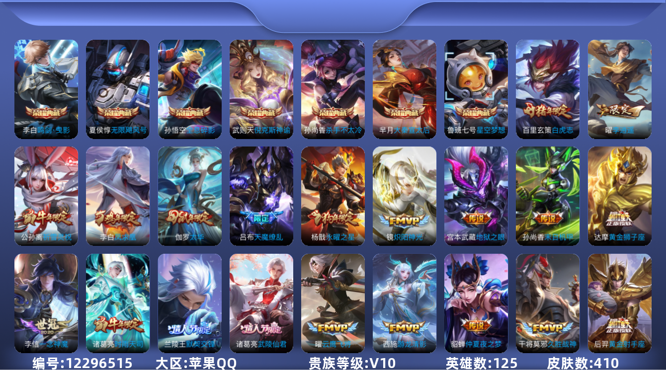 [12296515]V10 7典藏 36传说 125英雄 410皮肤 典藏英雄武则天 可修改实名 优质装备:星空梦想(太空人),倪克斯神谕(宇宙婆娘),无限飓风号(高达),杀手不太冷,大秦宣太后,鸣剑·曳影,全息碎影(猴子典藏),黄金狮子座,黄金射手座,冠军飞将,云鹰飞将(小将军),绛天战甲(鸡嘴战神),黄金白羊座,猫影幻舞,久胜战神,炽阳神光,一念神魔,云霓雀翎,末日机甲-孙尚香(绿蚂蚱),地狱火,仲夏夜之梦(大飞蛾),零号·赤焰,海洋之心,地狱之眼,飞鸢探春,胖达荣荣,李逍遥,乞巧织情,游龙清影(小青龙),淬星耀世,超时空战士-狄仁杰,妄想实况,艾琳觅芳踪 珍宝阁皮:蔷薇恋人,女武神,玩趣恶龙 限定皮:至尊宝,白虎志(电光耗子),凤求凰(白切鸡),凤凰于飞,太华(伽罗年限),梅西,武陵仙君(小桃花),傲雪梅枪,时之彼端,白鹤梁神女,魔法小厨娘,白晶晶,时雨天司(水龙头),神威(电光马子),飞衡(韩信年限),瑞麟志(木兰年限),遇见飞天,高山流水,五谷丰年,青龙志(铠年限),冰锋战神,天狼运算者,游园惊梦,梁祝,御风骁将(吕布年限),天狼狩猎者,龙胆,逐梦之翼,逐梦之星,烈魂,岱宗(典韦年限),天狼溯光者,虎魄,天狼征服者,奔雷神使(牛魔年限),祈雪灵祝(雪兔子),天狼绘梦者,李小龙,逐梦之影,逐梦之光,玄武志(苏烈年限),朱雀志(守约年限),永曜之星,辉光之辰,如梦令-嫦娥,如梦令-后羿,霸王别姬-项羽,霸王别姬-虞姬,奇迹圣诞,默契交锋-兰陵王,默契交锋-花木兰,猪悟能,一生所爱,大圣娶亲,引擎之心,天魔缭乱,青春决赛季,冰霜恋舞曲,云端筑梦师,乒乒小将,蜜橘之夏,神奇女侠,美猴王,匿光追影者,女儿国国王 史诗皮:遇见神鹿,紫霞仙子,苍穹之光,电玩小子(小书包),白龙吟,黄金分割率,特工魅影,千年之狐,江河有灵,魅语,高渐离燃音魔法,蒙恬荣光圣徽,无限星赏官,冰冠公主,偶像歌手,晚萤,电玩·爆裂旋风,暗夜猫娘,龙骑士(小龙虾),末日机甲-吕布,猫狗日记-孙策,猫狗日记-大乔,时之恋人-孙尚香,乱世虎臣,节奏热浪,修罗,女仆咖啡,摇滚巨星,水果甜心,绅士熊喵,天才门将,星夜王子,心灵骇客,功夫厨神,德古拉伯爵,暗隐猎兽者,幽灵船长,鬼剑武藏,心灵战警,舞动绿茵,地狱岩魂,诗语江南,纤云弄巧,繁星吟游(呼啦呼啦),拒霜思,缤纷独角兽,乘风破浪,逐浪之夏,月团寄思,水晶猎龙者,曙光