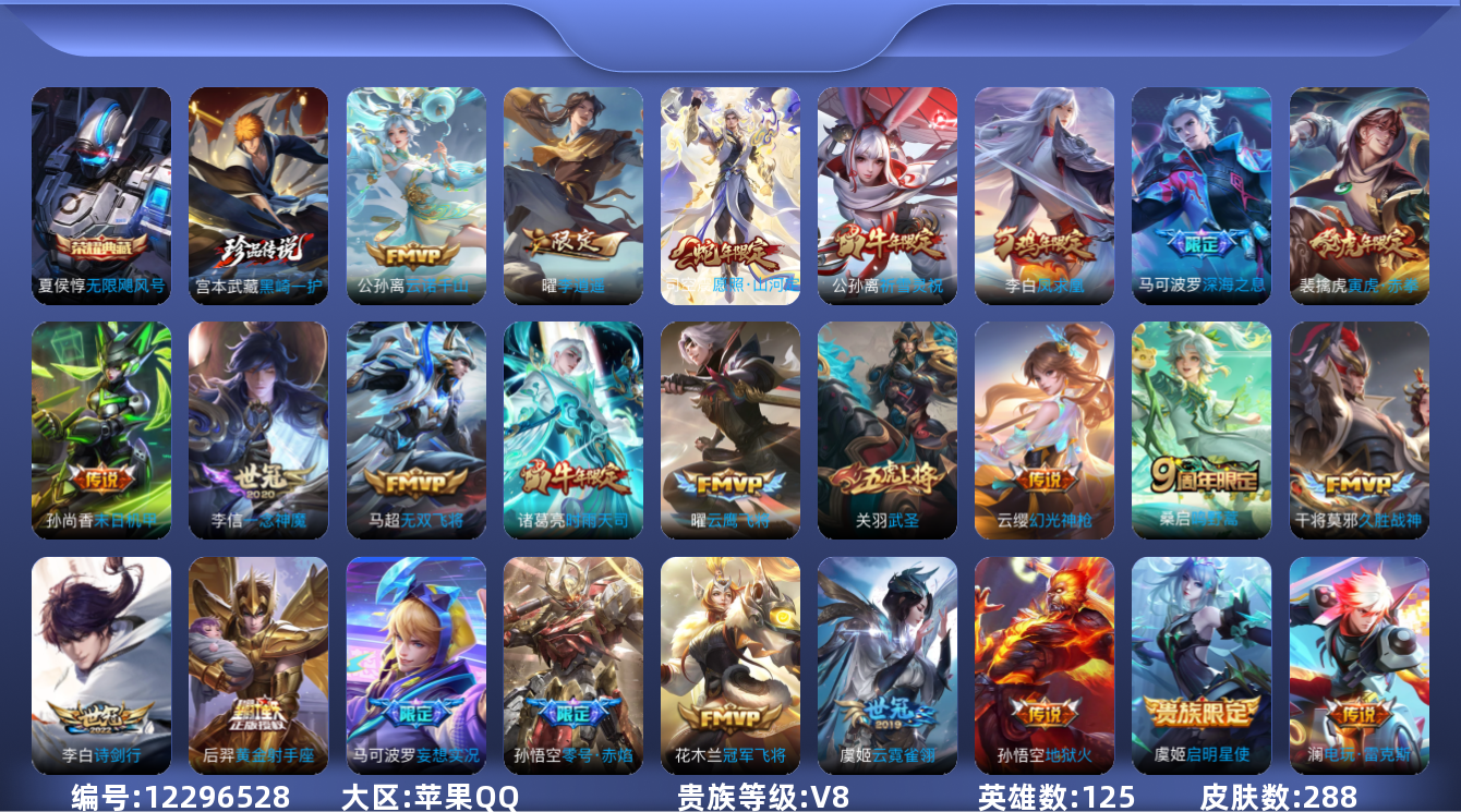 [12296528]V8 1典藏 1珍品传说 25传说 125英雄 288皮肤 可修改实名 优质装备:无限飓风号(高达),黑崎一护,黄金射手座,冠军飞将,云鹰飞将(小将军),久胜战神,一念神魔,云霓雀翎,末日机甲-孙尚香(绿蚂蚱),地狱火,零号·赤焰,李逍遥,无双飞将,电玩·雷克斯,妄想实况 传说皮:云诺千山,幻光神枪 珍宝阁皮:女武神,玩趣恶龙 限定皮:愿照·山河定(司空震年限),鸣野蒿,至尊宝,凤求凰(白切鸡),傲雪梅枪,时雨天司(水龙头),神威(电光马子),高山流水,诗剑行,五谷丰年,冰锋战神,武圣,游园惊梦,梁祝,逐梦之星,天狼溯光者,祈雪灵祝(雪兔子),天狼绘梦者,李小龙,朱雀志(守约年限),孙行者,大圣娶亲,青春决赛季,冰霜恋舞曲,女儿国国王,寅虎·赤拳(老虎年限),百木心枪,深海之息(深海大菠萝) 史诗皮:鸭鸭历险记-刘禅,器灵·浮梦炉,化蝶舞,灵蛊蚀心,龙之律动,石田雨龙,百相守梦-周瑜,百相守梦-黄忠,织梦人,紫霞仙子,苍穹之光,电玩小子(小书包),黄金分割率,特工魅影,千年之狐,江河有灵,真我赫兹(镜),魅语,百解令(蒙犽),蒙恬荣光圣徽,冰冠公主,偶像歌手,晚萤,末日机甲-吕布,猫狗日记-孙策,乱世虎臣,节奏热浪,修罗,女仆咖啡,水果甜心,天才门将,心灵骇客,功夫厨神,德古拉伯爵,暗隐猎兽者,鬼剑武藏,心灵战警,舞动绿茵,繁星吟游(呼啦呼啦),拒霜思,缤纷独角兽,乘风破浪,逐浪之夏,水晶猎龙者,曙光守护者,金属风暴,原初追逐者,圣诞狂欢,鹰眼统帅,暗夜贵公子,魅力维加斯,黎明之约,无心,未来纪元-赵云