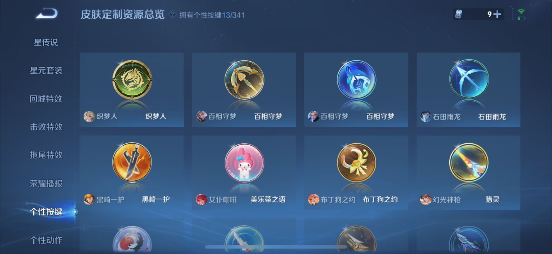 甄姬女儿国国王,伽罗天狼溯光者,赵云百木心枪,干将莫邪冰霜恋舞曲,诸葛亮时雨天司,公孙离祈雪灵祝,司空震愿照·山河定,裴擒虎李小龙,裴擒虎寅虎·赤拳,上官婉儿梁祝,上官婉儿天狼绘梦者,李白诗剑行,花木兰青春决赛季,马可波罗逐梦之星,马可波罗深海之息,桑启鸣野蒿,孙悟空孙行者,孙悟空大圣娶亲,孙悟空至尊宝,马超神威,韩信傲雪梅枪,百里守约朱雀志,关羽武圣,关羽冰锋战神