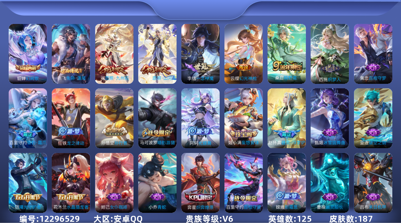 [12296529]V6 1典藏 1珍品传说 5传说 125英雄 187皮肤 可修改实名 优质装备:幻阙歌(貂蝉典藏),一念神魔 珍品传说:兔狲·蓬尾 传说皮:幻光神枪 珍宝阁皮:妄想食味 限定皮:愿照·九州拓(澜年限),愿照·山河定(司空震年限),逐霄战戟,鸣野蒿,孙行者 史诗皮:器灵·浮梦炉,化蝶舞,龙之律动,雪豹·霜爪,茶境仙,炽弈燎原,破空之剑,战舞者,蒙犽顽岩魄,决胜骁骑,蔬乡物语(鲁班七号),百相守梦-百里守约,百相守梦-黄忠,织梦人,特工魅影,千年之狐,江河有灵,百解令(蒙犽),高渐离燃音魔法,青蛇,末日机甲-吕布,猫狗日记-孙策,女仆咖啡,水果甜心,星夜王子,功夫厨神,幽灵船长,鬼剑武藏,心灵战警,舞动绿茵,纤云弄巧,拒霜思,逐浪之夏,水晶猎龙者,曙光守护者,圣诞恋歌,鹰眼统帅,魅力维加斯,未来纪元-赵云