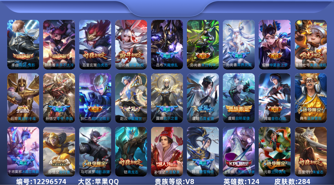 - [11529503]V8 1典藏 2珍品传说 11传说 126英雄 334皮肤 典藏英雄武则天 可修改实名 优质装备:鸣剑·曳影,江户川柯南,怪盗基德,云鹰飞将(小将军),地狱火,地狱之眼,乞巧织情,电玩·雷克斯,涂山容容 传说皮:幻光神枪 珍宝阁皮:蔷薇恋人,女武神 限定皮:愿照·岁时盈(虞姬年限),愿照·众生和(妲己年限),逐霄战戟,鸣野蒿,至尊宝,时雨天司(水龙头),遇见飞天,五谷丰年,游园惊梦,梁祝,逐梦之星,天狼溯光者,辉光之辰,大圣娶亲 史诗皮:鸭鸭历险记-刘禅,化蝶舞,灵蛊蚀心,星界战将,龙之律动,石田雨龙,百相守梦-周瑜,茶境仙,破空之剑,蒙犽顽岩魄,蔬乡物语(鲁班七号),百相守梦-百里守约,百相守梦-黄忠,织梦人,遇见神鹿,紫霞仙子,电玩小子(小书包),黄金分割率,特工魅影,千年之狐,江河有灵,魅语,百解令(蒙犽),高渐离燃音魔法,蒙恬荣光圣徽,冰冠公主,青蛇,偶像歌手,电玩·兔顽号,电玩·爆裂旋风,龙骑士(小龙虾),末日机甲-吕布,猫狗日记-孙策,猫狗日记-大乔,时之恋人-孙尚香,乱世虎臣,节奏热浪,女仆咖啡,摇滚巨星,水果甜心,绅士熊喵,天才门将,星夜王子,心灵骇客,功夫厨神,德古拉伯爵,暗隐猎兽者,幽灵船长,鬼剑武藏,心灵战警,乐园奇幻夜,天秀·启明,地狱岩魂,纤云弄巧,繁星吟游(呼啦呼啦),拒霜思,缤纷独角兽,乘风破浪,逐浪之夏,水晶猎龙者,曙光守护者,箭羽风息,金属风暴,圣诞狂欢,圣诞恋歌,鹰眼统帅,暗夜贵公子,魅力维加斯,黎明之约,未来纪元-赵云