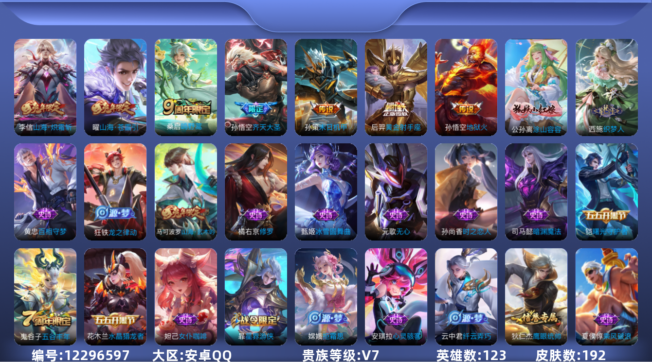 [12296597]V7 7传说 123英雄 192皮肤 可修改实名 女号 优质装备:黄金射手座,地狱火,末日机甲-孙策,山海·炽霜斩(李信年限),山海·苍雷引(电光曜子) 珍宝阁皮:优雅恋人,蔷薇恋人 限定皮:鸣野蒿,遇见飞天,齐天大圣,五谷丰年,山海·玄木吟(马可年限) 史诗皮:龙之律动,百相守梦-黄忠,织梦人,白龙吟,特工魅影,江河有灵,百解令(蒙犽),龙骑士(小龙虾),猫狗日记-孙策,时之恋人-孙尚香,乱世虎臣,节奏热浪,修罗,女仆咖啡,水果甜心,绅士熊喵,心灵骇客,功夫厨神,德古拉伯爵,暗隐猎兽者,鬼剑武藏,暗渊魔法,纤云弄巧,拒霜思,乘风破浪,逐浪之夏,水晶猎龙者,曙光守护者,箭羽风息,金属风暴,圣诞恋歌,鹰眼统帅,魅力维加斯,无心,未来纪元-赵云