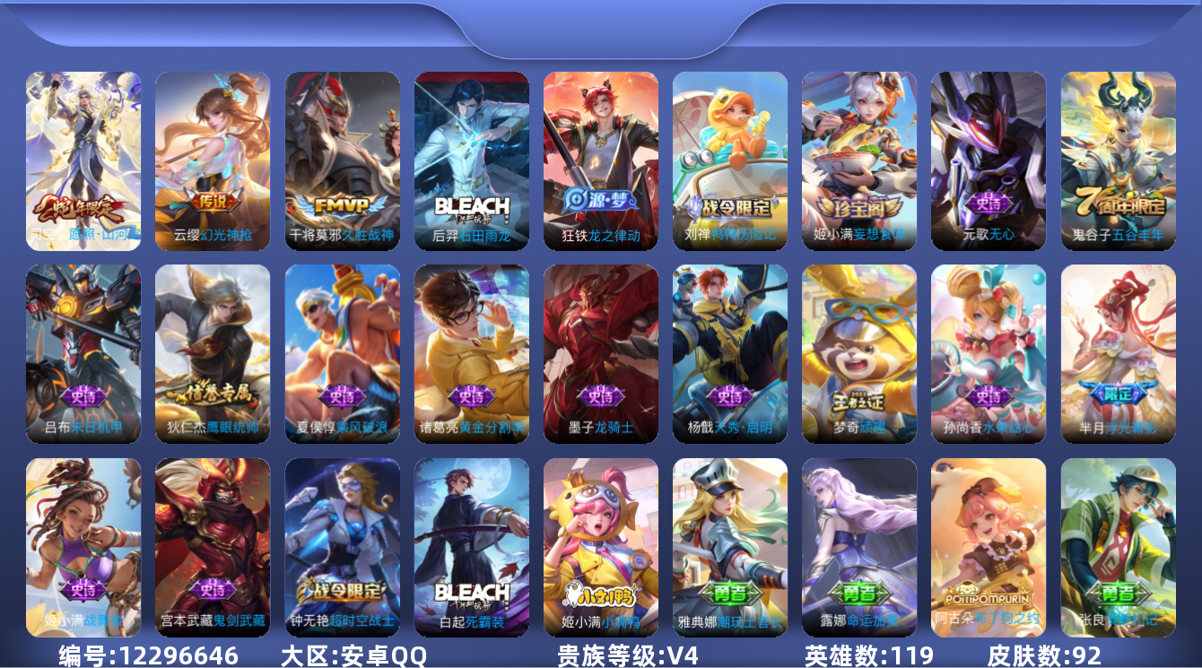 - [11603354]V7 1典藏 1珍品传说 6传说 123英雄 184皮肤 可修改实名 优质装备:鸣剑·曳影,黑崎一护,云鹰飞将(小将军),炽阳神光,末日机甲-孙尚香(绿蚂蚱) 传说皮:幻光神枪 珍宝阁皮:玩趣恶龙 限定皮:愿照·九州拓(澜年限),鸣野蒿,五谷丰年,岱宗(典韦年限),孙行者 史诗皮:鸭鸭历险记-刘禅,器灵·浮梦炉,化蝶舞,星界战将,谪仙醉月,龙之律动,石田雨龙,怒海争锋,破空之剑,蒙犽顽岩魄,芈月浮光幕影,蔬乡物语(鲁班七号),百相守梦-百里守约,百相守梦-黄忠,紫霞仙子,黄金分割率,特工魅影,永昼,江河有灵,百解令(蒙犽),高渐离燃音魔法,冰冠公主,偶像歌手,白蛇,暗夜猫娘,龙骑士(小龙虾),猫狗日记-孙策,时之恋人-孙尚香,乱世虎臣,节奏热浪,水果甜心,天才门将,星夜王子,心灵骇客,德古拉伯爵,暗隐猎兽者,幽灵船长,鬼剑武藏,心灵战警,天秀·启明,地狱岩魂,乘风破浪,逐浪之夏,水晶猎龙者,曙光守护者,箭羽风息,金属风暴,原初追逐者,圣诞恋歌,鹰眼统帅,魅力维加斯,赏金猎手,无心,未来纪元-赵云