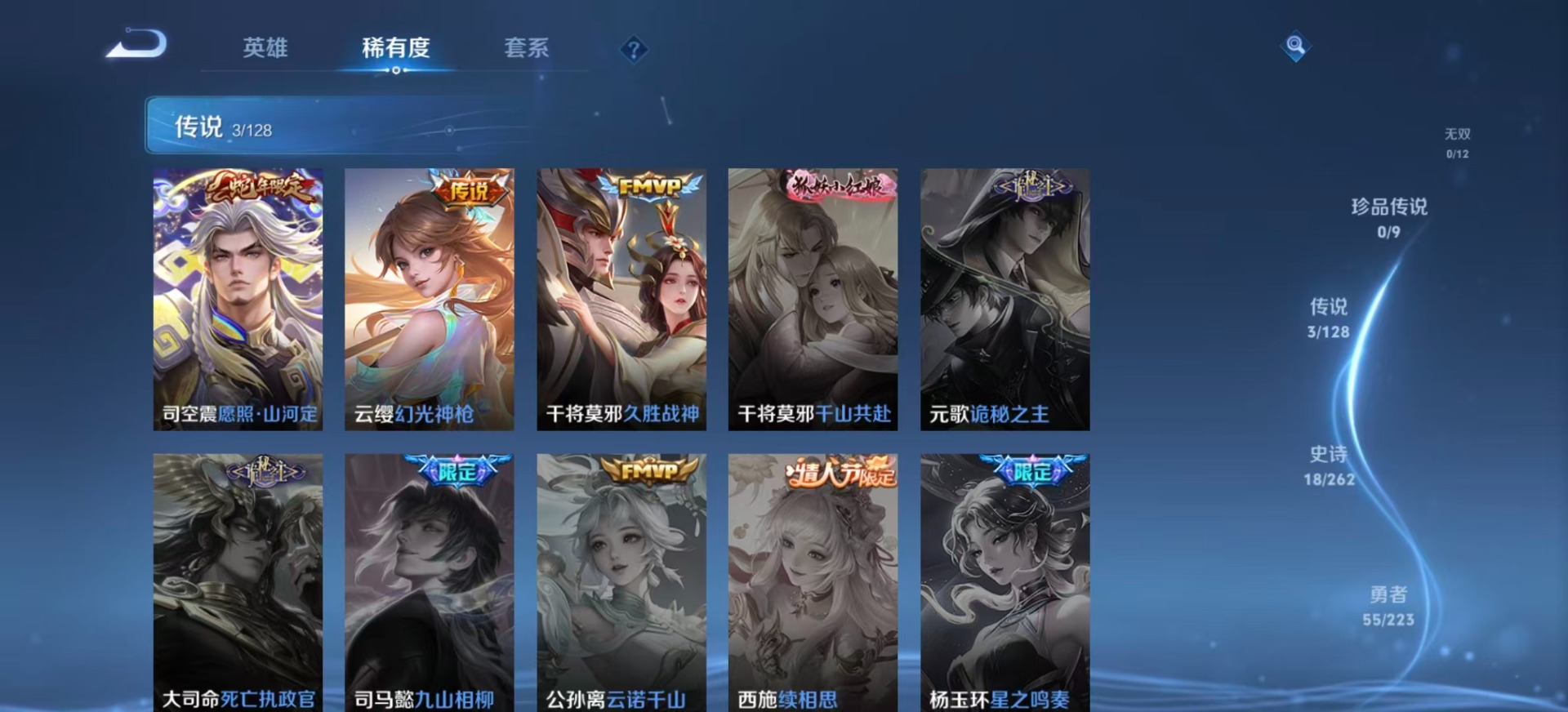 [12296646]V4 3传说 119英雄 92皮肤 可修改实名 优质装备:久胜战神 传说皮:幻光神枪 珍宝阁皮:妄想食味 限定皮:愿照·山河定(司空震年限),五谷丰年 史诗皮:鸭鸭历险记-刘禅,龙之律动,石田雨龙,战舞者,芈月浮光幕影,黄金分割率,龙骑士(小龙虾),末日机甲-吕布,水果甜心,鬼剑武藏,天秀·启明,乘风破浪,鹰眼统帅,无心