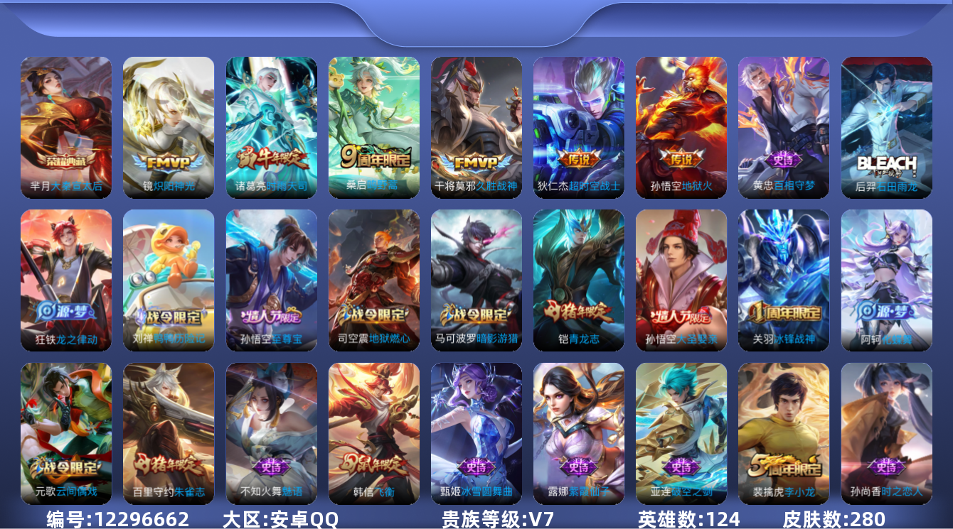 [12296662]V7 1典藏 6传说 124英雄 280皮肤 可修改实名 优质装备:大秦宣太后,久胜战神,炽阳神光,地狱火,超时空战士-狄仁杰 珍宝阁皮:优雅恋人,玩趣恶龙 限定皮:鸣野蒿,至尊宝,时雨天司(水龙头),飞衡(韩信年限),瑞麟志(木兰年限),遇见飞天,五谷丰年,青龙志(铠年限),冰锋战神,天狼运算者,李小龙,朱雀志(守约年限),霸王别姬-虞姬,大圣娶亲 史诗皮:鸭鸭历险记-刘禅,化蝶舞,星界战将,龙之律动,石田雨龙,茶境仙,破空之剑,蔬乡物语(鲁班七号),百相守梦-百里守约,百相守梦-黄忠,紫霞仙子,白龙吟,黄金分割率,特工魅影,千年之狐,永昼,江河有灵,魅语,百解令(蒙犽),蒙恬荣光圣徽,匿光破解者,青蛇,偶像歌手,白蛇,电玩·爆裂旋风,暗夜猫娘,末日机甲-吕布,猫狗日记-孙策,猫狗日记-大乔,时之恋人-孙尚香,乱世虎臣,节奏热浪,女仆咖啡,摇滚巨星,水果甜心,绅士熊喵,天才门将,星夜王子,心灵骇客,功夫厨神,德古拉伯爵,暗隐猎兽者,幽灵船长,鬼剑武藏,心灵战警,天秀·启明,舞动绿茵,纤云弄巧,繁星吟游(呼啦呼啦),拒霜思,缤纷独角兽,乘风破浪,逐浪之夏,水晶猎龙者,曙光守护者,箭羽风息,金属风暴,圣诞狂欢,圣诞恋歌,鹰眼统帅,暗夜贵公子,魅力维加斯,黎明之约,未来纪元-赵云