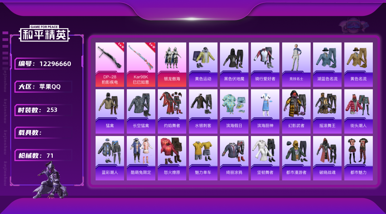 - [12240778]4粉装 3特效枪 10印记 可二次 可修改实名 优质装备:新星烈龙(小白龙),M416风花雪月,七级M416-风花雪月,星穹咏叹调,冷漠罗丽,Kar98K-巳巳如意 热门装扮:莲影清波,鹰眼刺客 稀有枪皮:DP-28-豹影疾电 五级特效枪:五级Kar98K-巳巳如意,五级DP-28-豹影疾电 紫色装扮:极速光影,SS31特训套装,云朵鹅,彩虹兔,雪绒豹,SS33特训套装,顶瓜瓜,SS23特训,田园牧歌,轻风白浪,SS22特训,夏日音浪,千禧之恋,吉莉礼服,完美偶像,帅气教官,幻世战舞者,幻影武者,战地督导,冷焰舞者,人气偶像,冰川特警,娇憨猪猪,SS16特训,冰爽风暴,瑞龙福将,团圆交子,SS17特训,萌趣颜团子,特种颜团子,SS15特训,暗夜傀儡,SS21特训,SS20特训,战地菁英,萌趣咩咩,竞技角斗士,雪兔飞飞,异彩先驱,缤纷焰火,SS18特训,飞驰魅影,音速流光,SS19特训,龙的传人,骑行爱好者,魅力单车,鹤鸣,麻辣教官,黄色伏地魔,黄色名流,黄色运动,黎明保卫者,黑色伏地魔,龙腾端午,风暴特警,龟仙人,都市魅力,酒红色名流,酷潮明星,野性山猫,野性战心,长空猛禽,雨林探路者,雪山征服者,霓虹极客,霓虹街区,青年教官,绛羽幽主,探宝勇士,炫蓝之夏,清新柠檬,湖蓝色名流,滨海假日,滨海厨神,灰色格斗者,灼焰舞者,热血青春,牛气冲天,牛气满满,特战英豪,深蓝色名流,极地朋克,极速红龙,柠萌假日,橘黑制服,沙漠兵团,沙漠毒蛇,派对绅士,绮丽涂鸦,缤纷果语,耀眼新星,红色运动,蓝彩潮人,蓝色运动,虎虎生威吉莉,街头潮人,超能勇士,白色伏地魔,猎鹰,猛禽,王牌教练,甜蜜告白,甜蜜熊情侣,甜蜜菠萝,破晓战魂,破蛋小黄鸡,福星高照,空投萌叽,竞技达人朋克,SS29特训,SS28特训,玉兔迎春,燕燕于飞,巳巳如意,智谋强哥,鱼渊荷华,竞技名士,惊鸿侠骨,SS24特训(SS24特训套装),SS25特训,元气发射,锦衣飞扬,金羽特工,焰鹰斗篷,幻羽潜行,幽夜迷踪,SS27特训,湖雨初晴,冰公主,晨曦薄雾,SS26特训,春光漫游,快闪甜心,白糯汤圆,精神漫游,SS8特训,SS12特训,SS11特训,耀粉歌者,大橘大利,星渊小夜曲,星影赞美诗,绯格组合,春日漫步,猎影月神,青玉碎影,萌黄之夏,SS32特训服(SS32特训套装),紫幽梦,蓝冰羽,恋语绒绒,粉恋花,光之冒险,漫步者