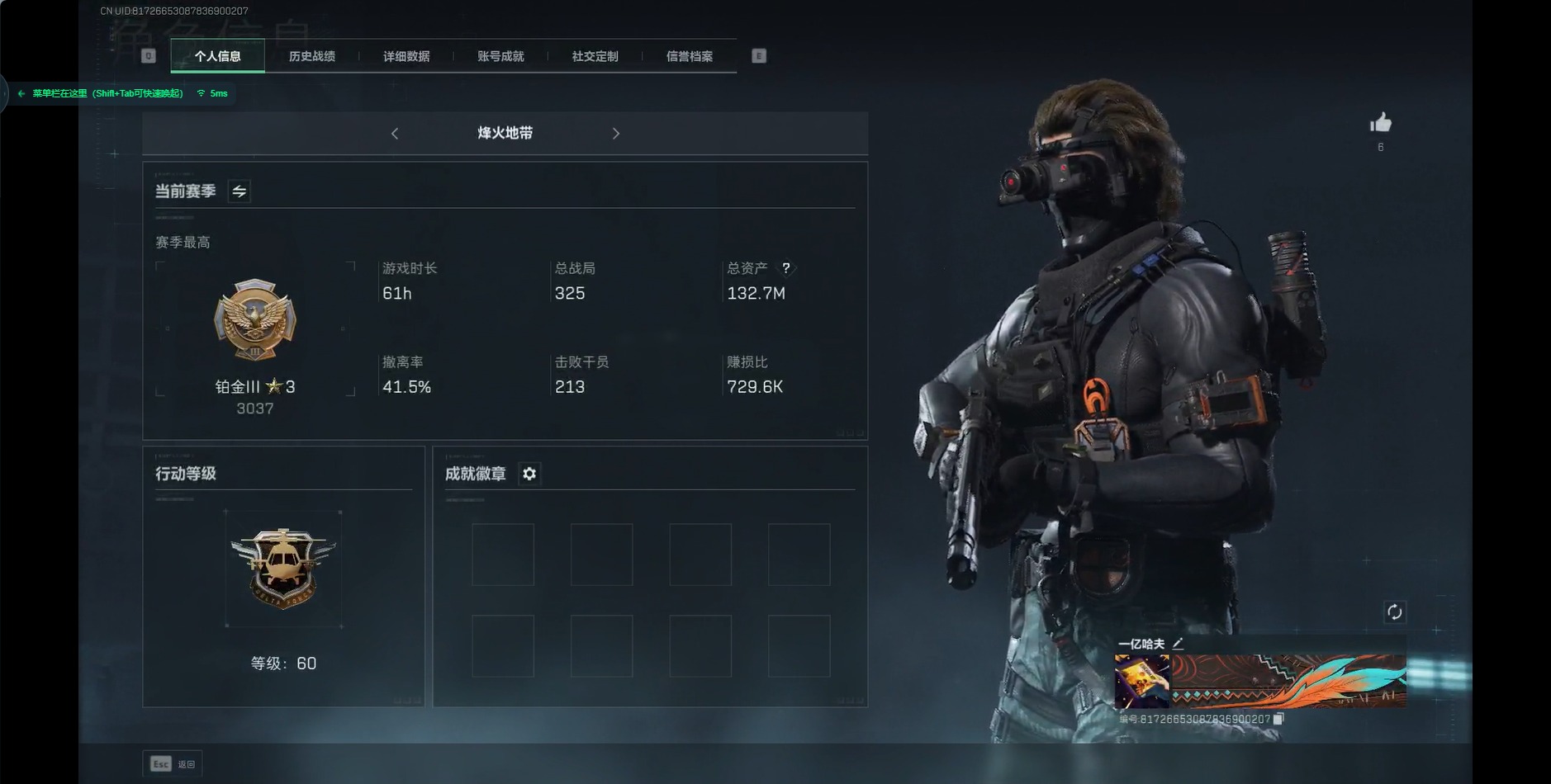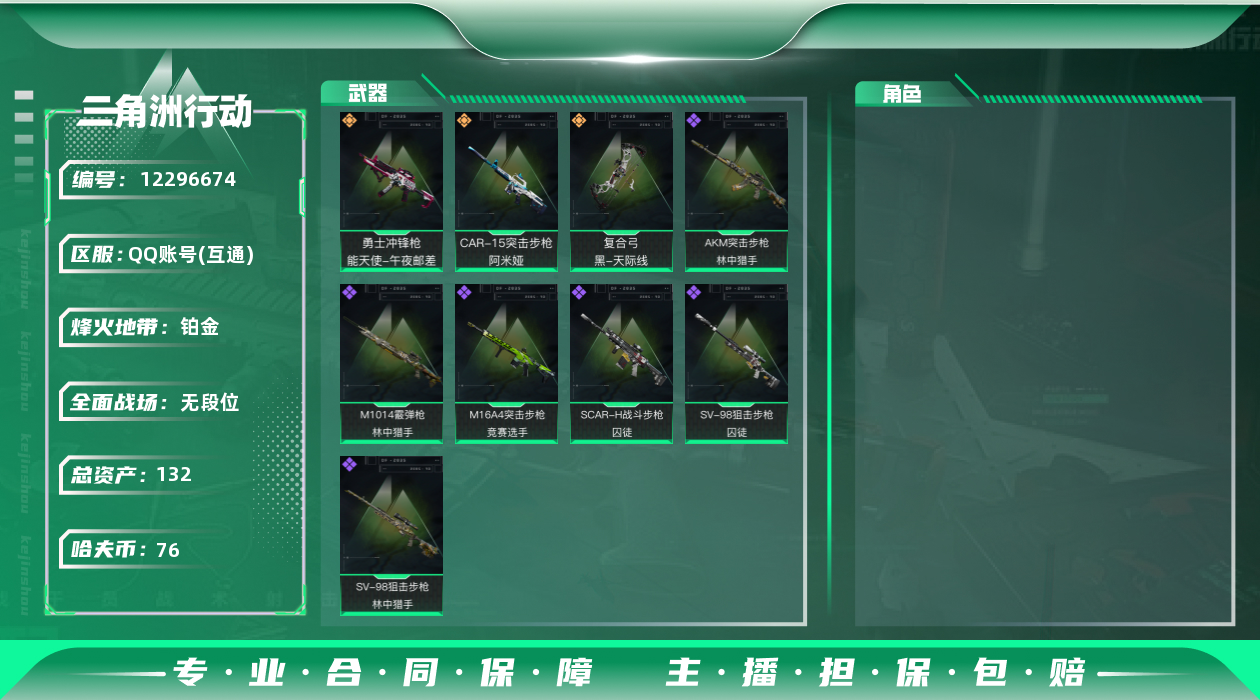 [12296674]总资产:132.7M 3传说枪械 哈夫币:76.480K 进阶安全箱(9.17到期) 可二次 可修改实名 烽火地带段位:铂金 全面战场段位:无段位 传说武器皮肤:CAR-15突击步枪-阿米娅,复合弓-黑-天际线,勇士冲锋枪-能天使-午夜邮差 史诗武器皮肤:M16A4突击步枪-竞赛选手,AKM突击步枪-林中猎手,M1014霰弹枪-林中猎手,SV-98狙击步枪-林中猎手,SV-98狙击步枪-囚徒,SCAR-H战斗步枪-囚徒