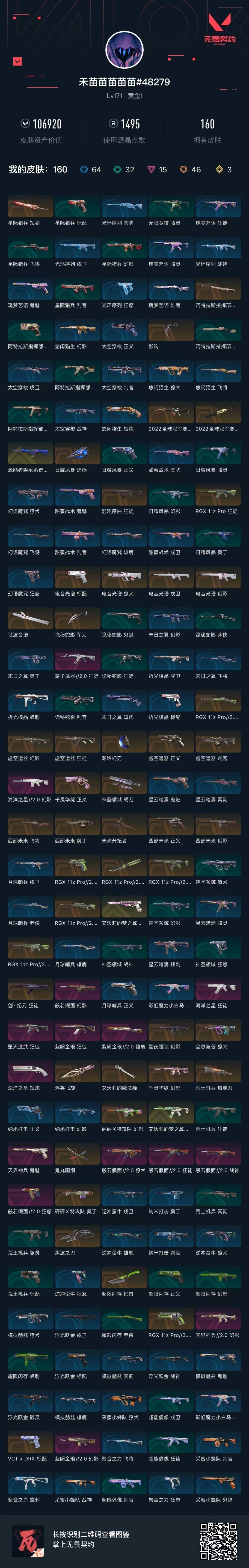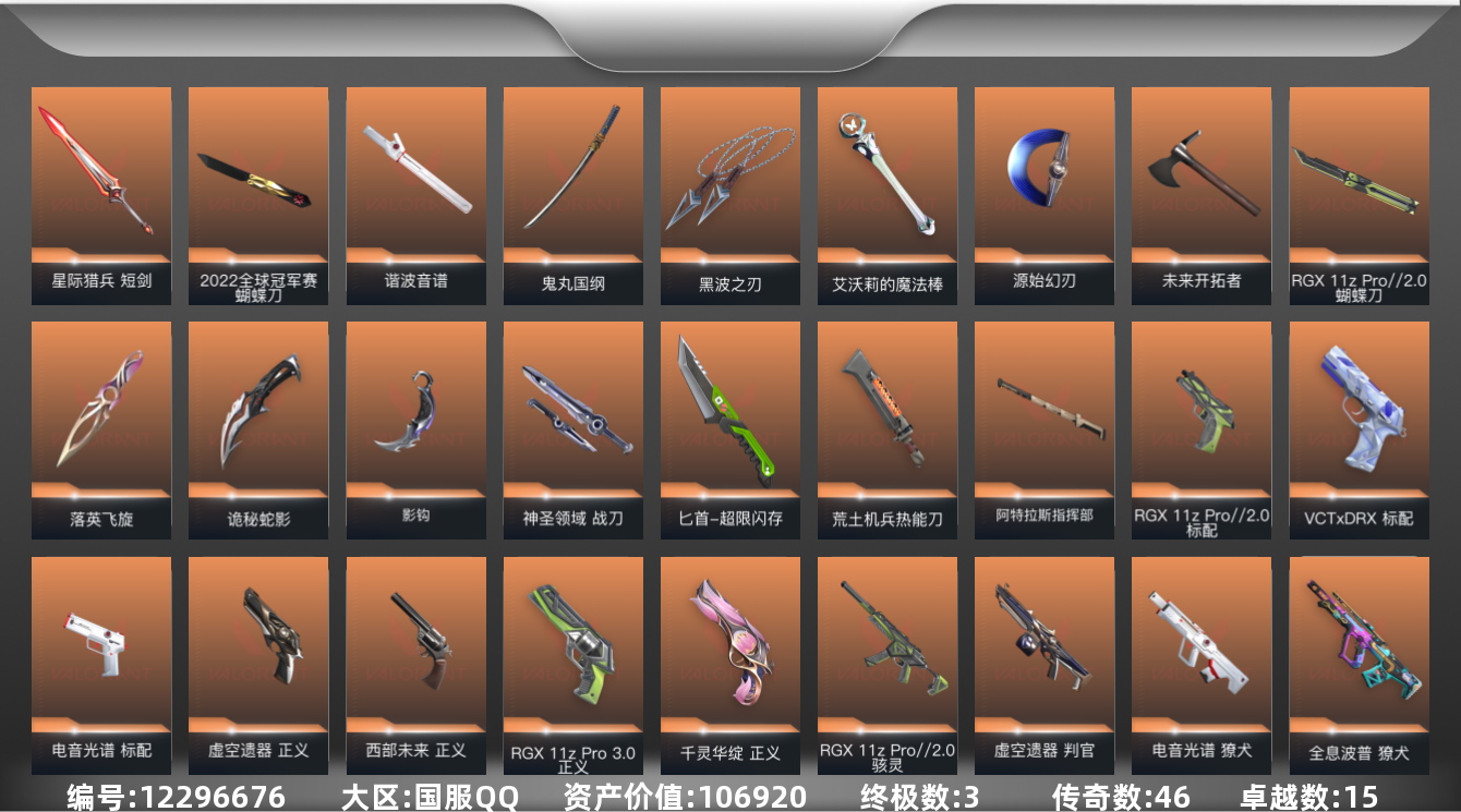 [12296676]46橙皮 3金皮 15紫皮 160皮肤 27英雄 172卡面 1495已用源晶 黄金 优质装备:幻影-千灵华绽,幻影-源能者娱乐系统,狂徒-混沌序曲,幻影-砰砰X特攻队,狂徒-紫阙金琅,幻影-紫阙金琅2.0,幻影-天界神兵2.0,幻影-般若假面,正义-千灵华绽,正义-RGX 11z Pro 3.0,幻影-黯夜怪谈,骇灵-艾沃莉的梦之翼,奥丁-砰砰X特攻队,鬼魅-天界神兵,獠犬-全息波普,黑波之刃,落英飞旋,鬼魅-艾沃莉的梦之翼,艾沃莉的魔法棒,匕首-超限闪存,荒土机兵热能刀,鬼丸国纲,神圣领域 战刀,RGX 11z Pro//2.0 蝴蝶刀,未来开拓者,源始幻刃,诡秘蛇影,谐波音谱,阿特拉斯指挥部,影钩,星际猎兵 短剑,雄鹿-紫阙金琅2.0 亮点皮肤:幻影-2022全球冠军赛,2022全球冠军赛 蝴蝶刀 套装:般若假面//2.0套装,2022全球冠军赛,电音光谱,虚空遗器,西部未来,RGX 11z Pro//2.0 佩枪皮肤:狂怒-般若假面//2.0,标配-电音光谱,正义-虚空遗器,标配-RGX 11z Pro//2.0,正义-西部未来,标配-VCTxDRX,短炮-海洋之星 冲锋枪皮肤:骇灵-RGX 11z Pro//2.0 霰弹枪皮肤:判官-虚空遗器 步枪皮肤:幻影-虚空遗器,幻影-海洋之星2.0,幻影-西部未来,幻影-RGX 11z Pro//2.0,狂徒-创·纪元,狂徒-般若假面//2.0,狂徒-虚空遗器,獠犬-般若假面//2.0,幻影-电音光谱,RGX 11z pro 狂徒,戌卫-电音光谱,獠犬-电音光谱,狂徒-离子武器2.0,狂徒-海洋之星,狂徒-堕天遗武 狙击枪皮肤:冥驹-RGX 11z Pro//2.0,飞将-西部未来,莽侠-RGX 11z Pro 3.0 机枪皮肤:奥丁-西部未来,战神-般若假面//2.0