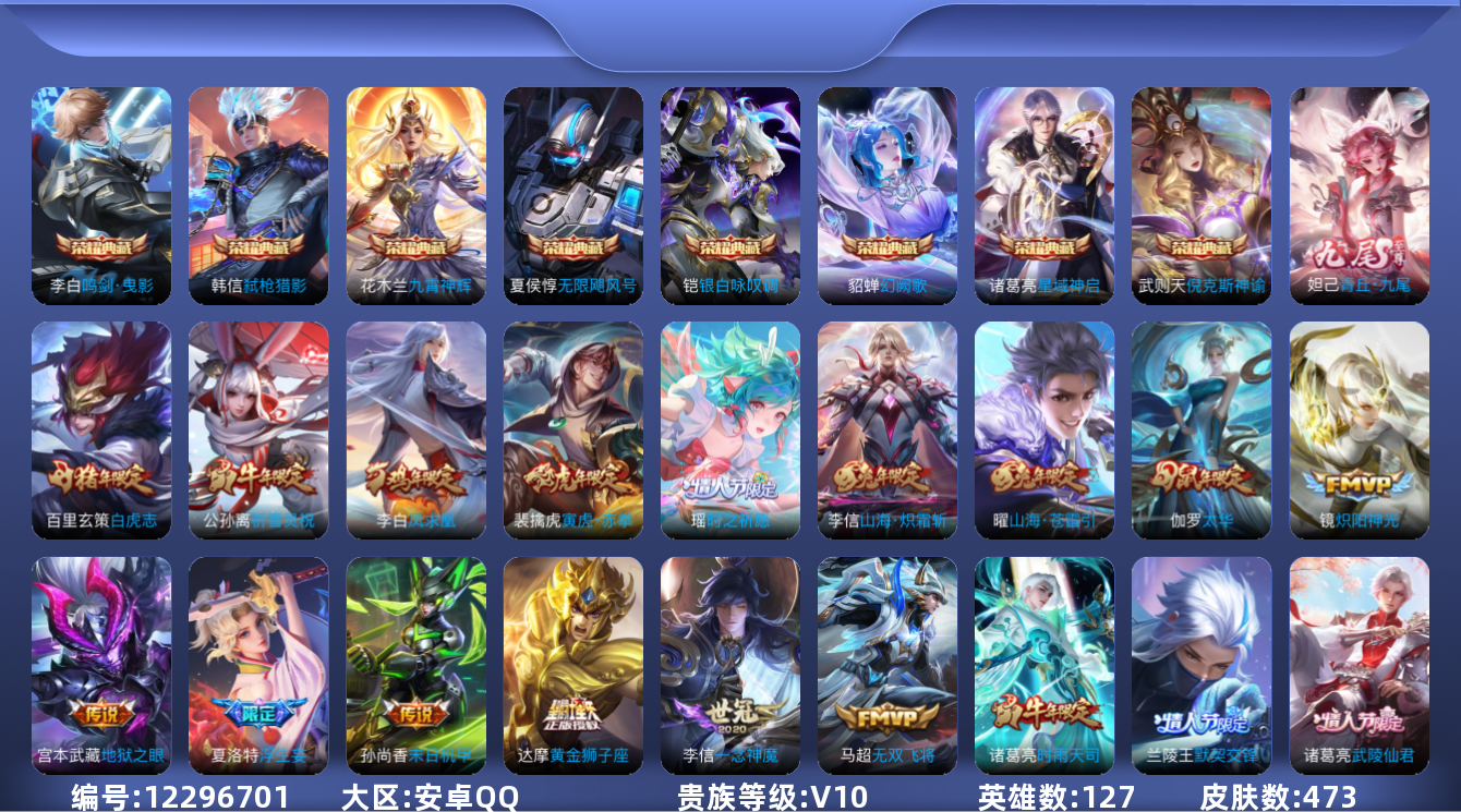 [12296701]V10 127英雄 437皮肤 8荣耀典藏 1无双 63传说 160史诗 可修改实名 优质装备:倪克斯神谕(宇宙婆娘),无限飓风号(高达),鸣剑·曳影,星域神启(倪克斯贼亮),九霄神辉(木兰典藏),银白咏叹调(倪克斯侍卫),幻阙歌(貂蝉典藏),弑枪猎影(韩信典藏),青丘·九尾(妲己无双),黄金狮子座,黄金射手座,冠军飞将,云鹰飞将(小将军),绛天战甲(鸡嘴战神),久胜战神,炽阳神光,一念神魔,云霓雀翎,末日机甲-孙尚香(绿蚂蚱),地狱火,仲夏夜之梦(大飞蛾),音你心动-小乔,零号·赤焰,海洋之心,地狱之眼,胖达荣荣,乞巧织情,淬星耀世,遇见胡旋,末日机甲-孙策,挚爱之约,挚爱花嫁,无双飞将,碎云,神器·狴犴令,山海·炽霜斩(李信年限),山海·琳琅生(小乔年限),山海·苍雷引(电光曜子),炽翼辉光(娃娃菜牛角包),燃星之曲,画中仙,浮生妄,记忆之芯(机甲兔),百相守梦(张飞),追逃游戏(亚瑟),追逃游戏(安琪拉),电玩·雷克斯,鹤羽星尊,灼幽烈阳,妄想实况,妄想奇谈,艾琳觅芳踪 限定皮:白虎志(电光耗子),凤求凰(白切鸡),太华(伽罗年限),武陵仙君(小桃花),异界灵契(白毛香),星穹之声,绯月行,时雨天司(水龙头),无限倾心-项羽,诗剑行,无限倾心-虞姬,齐天大圣,怒海麟威,祈雪灵祝(雪兔子),默契交锋-兰陵王,寅虎·瑞焰(虎皮蛋子),寅虎·赤拳(老虎年限),时之祈愿-瑶(瑶传限),启示之音