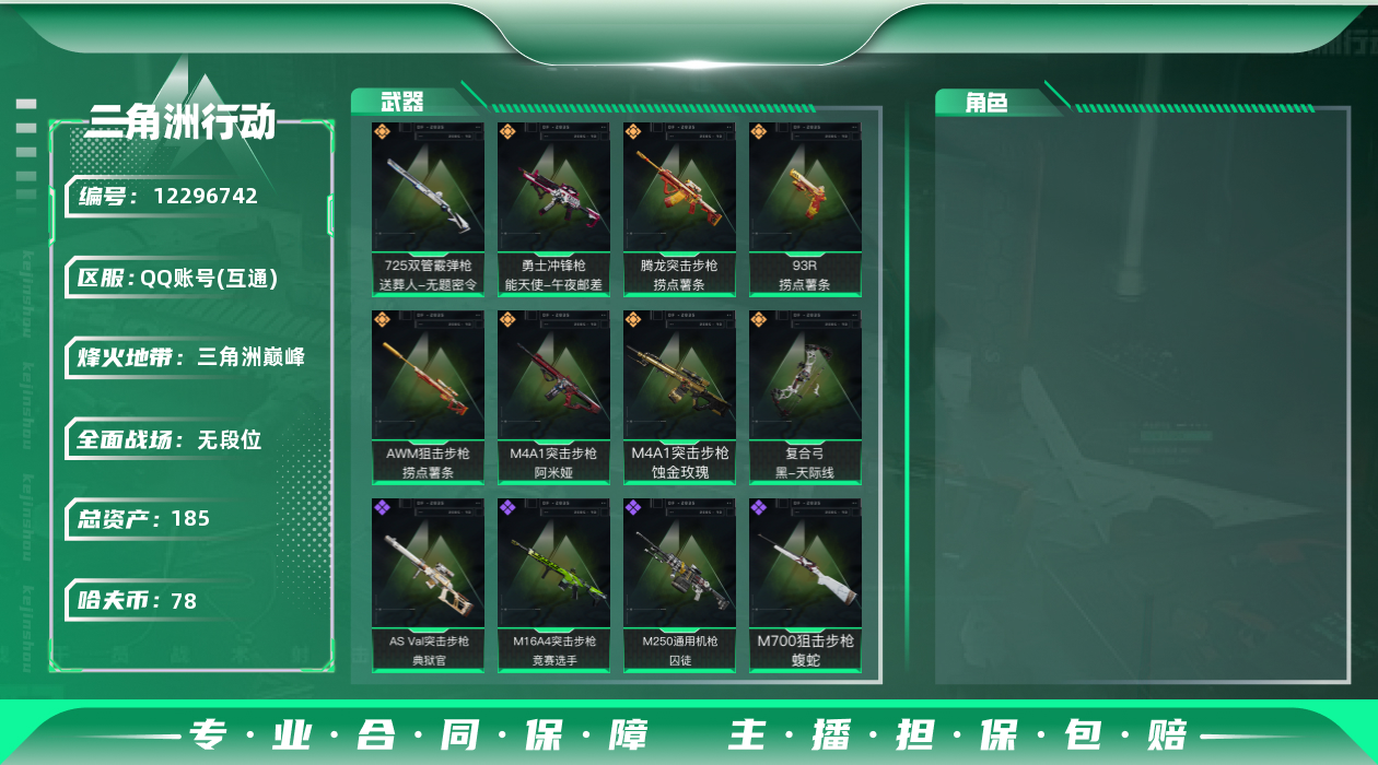 [12296742]总资产:185M 8传说枪械 哈夫币:78.774K 高级安全箱(2×3)9.15号到期 可二次 可修改实名 烽火地带段位:三角洲巅峰 全面战场段位:无段位 传说武器皮肤:M4A1突击步枪-阿米娅,复合弓-黑-天际线,AWM狙击步枪-捞点薯条,腾龙突击步枪-捞点薯条,93R-捞点薯条,勇士冲锋枪-能天使-午夜邮差,725双管霰弹枪-送葬人-无题密令,M4A1突击步枪-蚀金玫瑰 史诗武器皮肤:M700狙击步枪-蝮蛇,PKM通用机枪-蝮蛇,M16A4突击步枪-竞赛选手,PKM通用机枪-荒野求生,SR-3M紧凑突击步枪-荒野求生,SV-98狙击步枪-林中猎手,SVD狙击步枪-荒野求生,AS Val突击步枪-典狱官,M250通用机枪-囚徒,SCAR-H战斗步枪-囚徒,腾龙突击步枪-无垢,MP7冲锋枪-无垢,PSG-1射手步枪-无垢