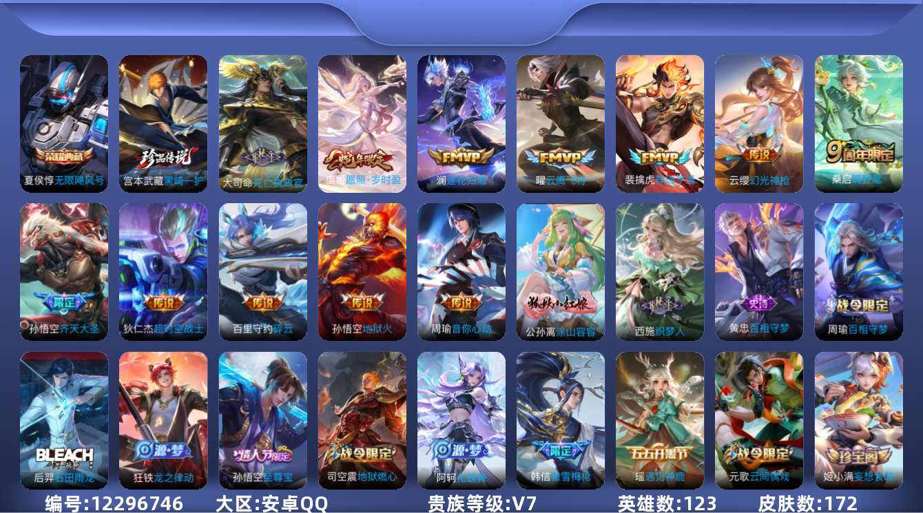 [12296746]V7 1典藏 1珍品传说 12传说 123英雄 172皮肤 可修改实名 优质装备:无限飓风号(高达),黑崎一护,云鹰飞将(小将军),地狱火,音你心动-周瑜,超时空战士-狄仁杰,碎云,澜逐花归海,涂山容容 传说皮:死亡执政官,祥瑞亨通,幻光神枪 珍宝阁皮:妄想食味,胡桃夹子 限定皮:愿照·岁时盈(虞姬年限),鸣野蒿,至尊宝,傲雪梅枪,齐天大圣,梁祝,引擎之心 史诗皮:化蝶舞,星界战将,龙之律动,石田雨龙,百相守梦-周瑜,百相守梦-百里守约,星界特工,百相守梦-黄忠,织梦人,遇见神鹿,电玩小子(小书包),特工魅影,江河有灵,匿光侦查者,百解令(蒙犽),青蛇,电玩·爆裂旋风,龙骑士(小龙虾),末日机甲-吕布,猫狗日记-孙策,乱世虎臣,节奏热浪,水果甜心,绅士熊喵,功夫厨神,暗隐猎兽者,鬼剑武藏,舞动绿茵,地狱岩魂,拒霜思,缤纷独角兽,乘风破浪,逐浪之夏,水晶猎龙者,曙光守护者,金属风暴,鹰眼统帅,无心,未来纪元-赵云