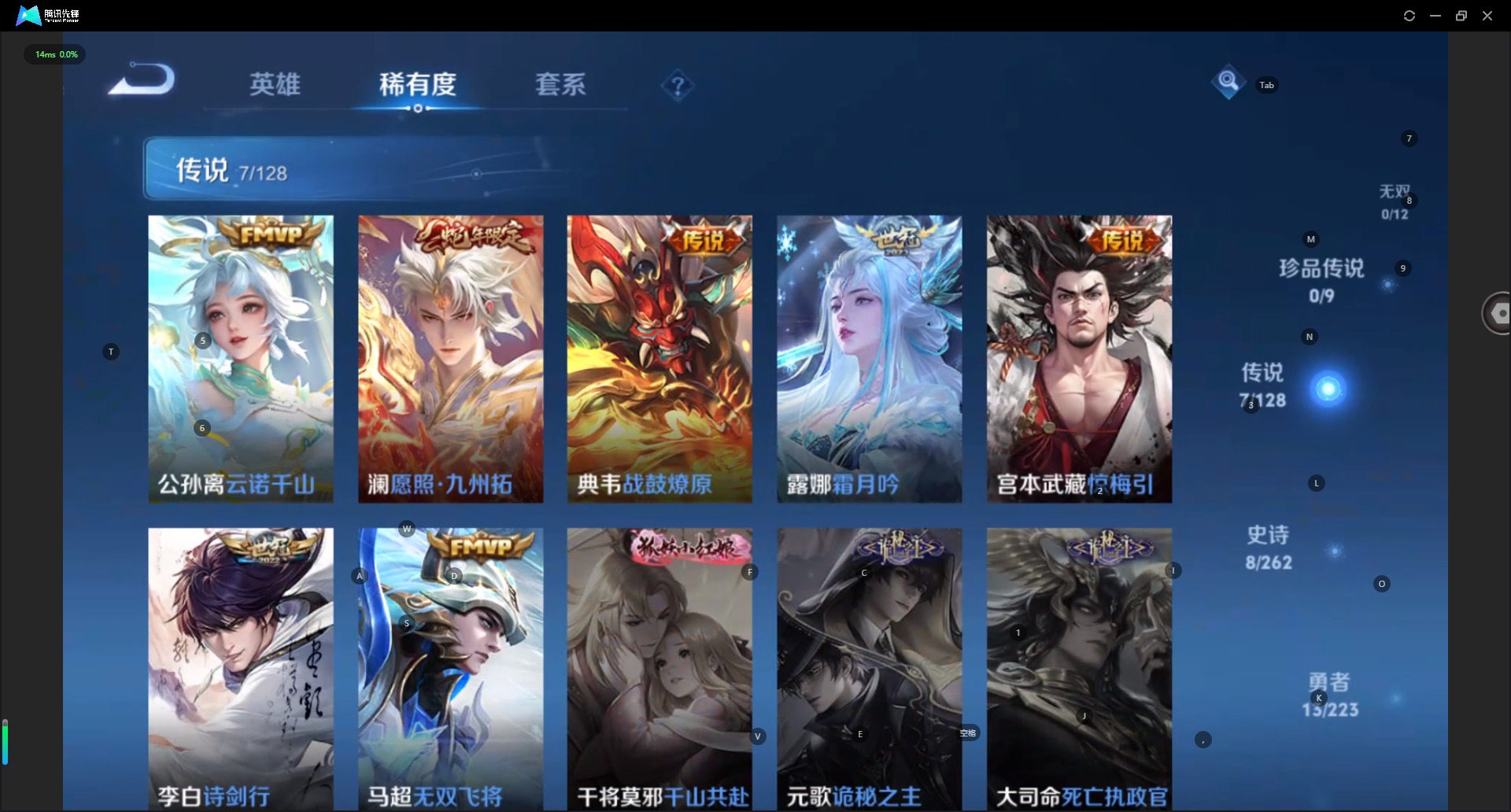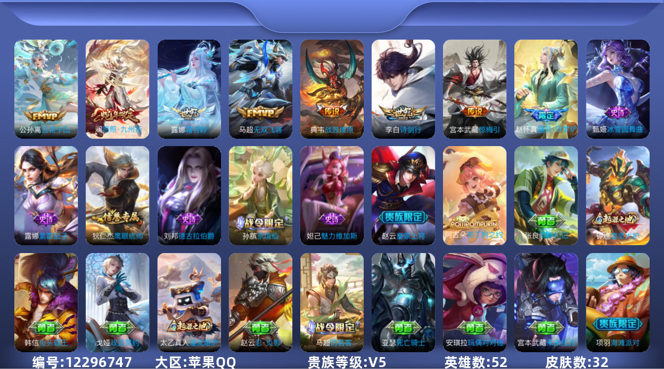 [12296747]V5 7传说 52英雄 32皮肤 可修改实名 优质装备:无双飞将,惊梅引,霜月吟 传说皮:典韦战鼓燎原,云诺千山 限定皮:愿照·九州拓(澜年限),诗剑行 史诗皮:器灵·浮梦炉,茶境仙,紫霞仙子,德古拉伯爵,鹰眼统帅,魅力维加斯