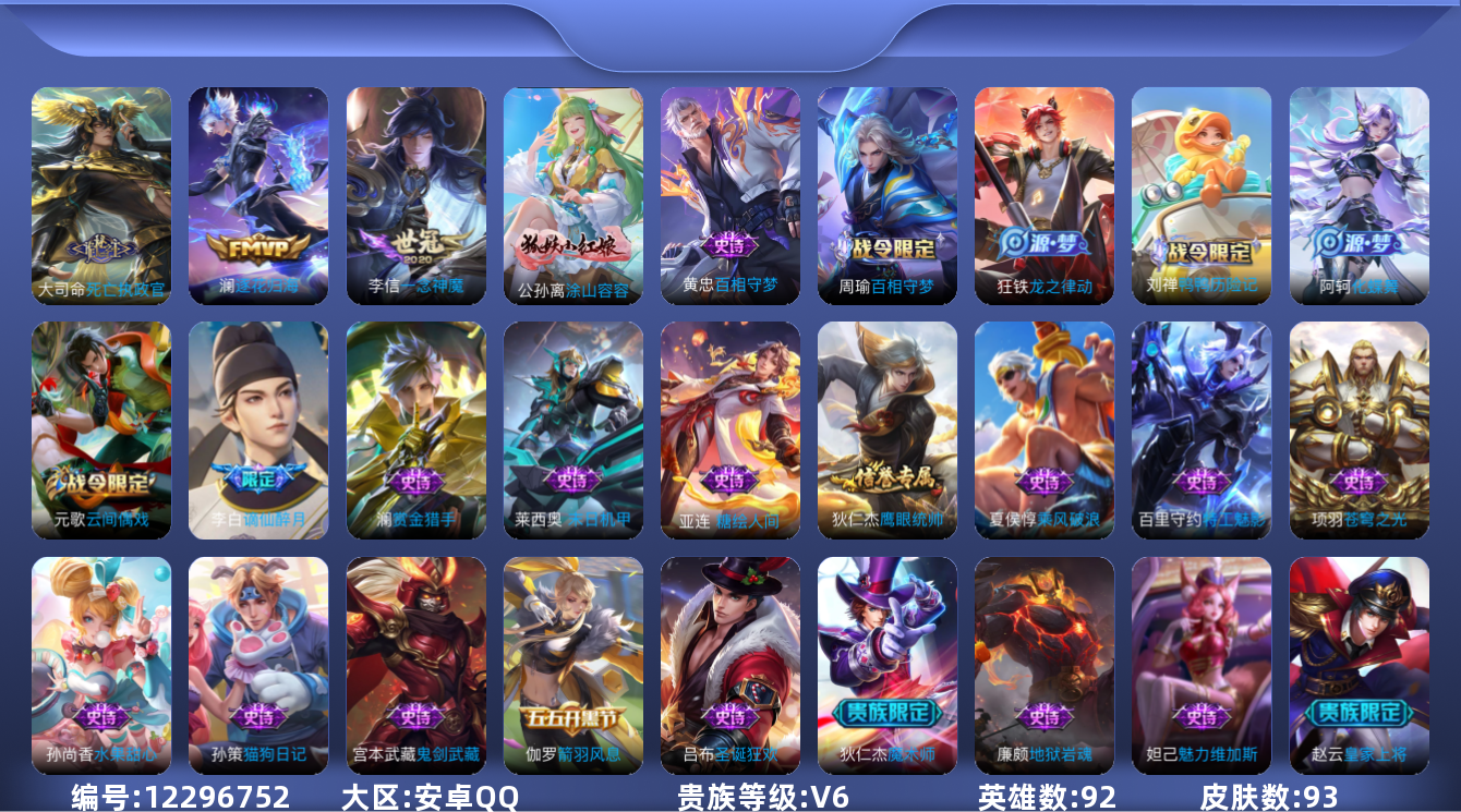 [12296752]V6 3传说 92英雄 93皮肤 可修改实名 优质装备:一念神魔,澜逐花归海,涂山容容 传说皮:死亡执政官 限定皮:逐霄战戟 史诗皮:鸭鸭历险记-刘禅,糖绘人间,化蝶舞,谪仙醉月,龙之律动,百相守梦-周瑜,百相守梦-黄忠,苍穹之光,特工魅影,末日机甲-莱西奥,猫狗日记-孙策,摇滚巨星,水果甜心,鬼剑武藏,地狱岩魂,乘风破浪,箭羽风息,圣诞狂欢,鹰眼统帅,魅力维加斯,赏金猎手