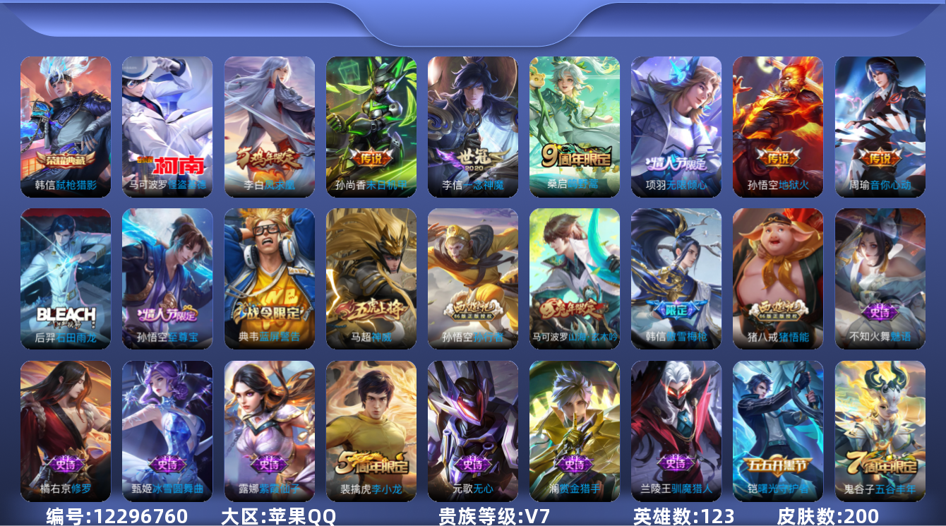 - [12091551]V7 1典藏 2珍品传说 16传说 125英雄 242皮肤 可修改实名 优质装备:鸣剑·曳影,江户川柯南,怪盗基德,一念神魔,仲夏夜之梦(大飞蛾),胖达荣荣,超时空战士-狄仁杰 传说皮:星之鸣奏,祥瑞亨通,幻光神枪 珍宝阁皮:妄想食味,蔷薇恋人 限定皮:愿照·九州拓(澜年限),愿照·福禄聚(蔡文姬年限),愿照·岁时盈(虞姬年限),愿照·山河定(司空震年限),愿照·众生和(妲己年限),愿照·千秋盛(女娲年限),逐霄战戟,鸣野蒿,异界灵契(白毛香),傲雪梅枪,绯月行,神威(电光马子),高山流水,五谷丰年,梁祝,岱宗(典韦年限),李小龙,孙行者,玉兔公主 史诗皮:狼魂孤将,化蝶舞,星界战将,茶境仙,破空之剑,芈月浮光幕影,琥珀纪元伽罗,上官婉儿群星魔术团,百相守梦-百里守约,紫霞仙子,千年之狐,江河有灵,百解令(蒙犽),高渐离燃音魔法,冰冠公主,暗夜猫娘,猫狗日记-孙策,乱世虎臣,修罗,女仆咖啡,水果甜心,天才门将,星夜王子,心灵骇客,时之奇旅-安琪拉,暗隐猎兽者,幽灵船长,鬼剑武藏,乐园奇幻夜,舞动绿茵,纤云弄巧,繁星吟游(呼啦呼啦),拒霜思,乘风破浪,逐浪之夏,水晶猎龙者,金属风暴,原初追逐者,圣诞狂欢,圣诞恋歌,鹰眼统帅,魅力维加斯,未来纪元-赵云