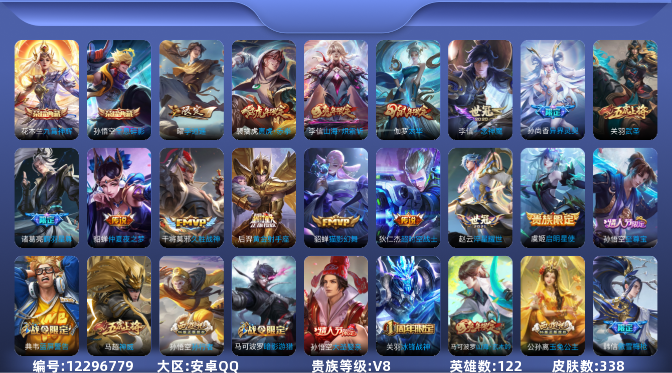 [12296779]V8 2典藏 15传说 122英雄 338皮肤 可修改实名 优质装备:全息碎影(猴子典藏),九霄神辉(木兰典藏),黄金射手座,猫影幻舞,久胜战神,一念神魔,仲夏夜之梦(大飞蛾),李逍遥,淬星耀世,超时空战士-狄仁杰,山海·炽霜斩(李信年限),鹤羽星尊 珍宝阁皮:蔷薇恋人,女武神 限定皮:至尊宝,太华(伽罗年限),异界灵契(白毛香),傲雪梅枪,神威(电光马子),瑞麟志(木兰年限),遇见飞天,高山流水,匿光决锋者,五谷丰年,冰锋战神,武圣,游园惊梦,梁祝,御风骁将(吕布年限),天狼溯光者,李小龙,逐梦之影,孙行者,猪悟能,大圣娶亲,青春决赛季,匿光追影者,寅虎·赤拳(老虎年限),时之祈愿-云中君,玉兔公主,山海·玄木吟(马可年限) 史诗皮:紫霞仙子,苍穹之光,白龙吟,黄金分割率,特工魅影,千年之狐,永昼,浮梦罗烟,魅语,冰冠公主,偶像歌手,晚萤,电玩·爆裂旋风,暗夜猫娘,百相守梦(关羽),末日机甲-吕布,乱世虎臣,节奏热浪,修罗,女仆咖啡,摇滚巨星,水果甜心,绅士熊喵,星夜王子,心灵骇客,功夫厨神,德古拉伯爵,暗隐猎兽者,幽灵船长,鬼剑武藏,暗渊魔法,心灵战警,天秀·启明,舞动绿茵,地狱岩魂,纤云弄巧,繁星吟游(呼啦呼啦),拒霜思,缤纷独角兽,乘风破浪,逐浪之夏,水晶猎龙者,曙光守护者,箭羽风息,金属风暴,原初追逐者,圣诞狂欢,圣诞恋歌,鹰眼统帅,魅力维加斯,黎明之约,无心,未来纪元-赵云