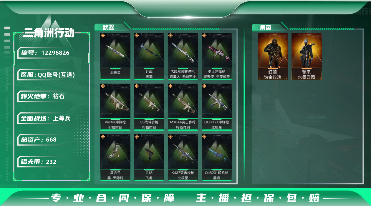 [12296826]总资产:668.2M 2干员外观 2近战传说 16传说枪械 哈夫币:232K 高级安全箱(2×3)9.15号到期 可二次 可修改实名 优质装备:近战-黑海,近战-北极星 烽火地带段位:钻石 全面战场段位:上等兵 传说武器皮肤:SR-25射手步枪-水墨云图,G18-飞虎,SMG45冲锋枪-骑士,M16A4突击步枪-狩猎时刻,复合弓-黑-天际线,Vector冲锋枪-狩猎时刻,G3战斗步枪-狩猎时刻,QCQ171冲锋枪-北极星,勇士冲锋枪-能天使-午夜邮差,725双管霰弹枪-送葬人-无题密令,K437突击步枪-北极星,MP5冲锋枪-黑海,QJB201轻机枪-黑海,P90冲锋枪-神秘艺术 干员外观:红狼-蚀金玫瑰,骇爪-水墨云图