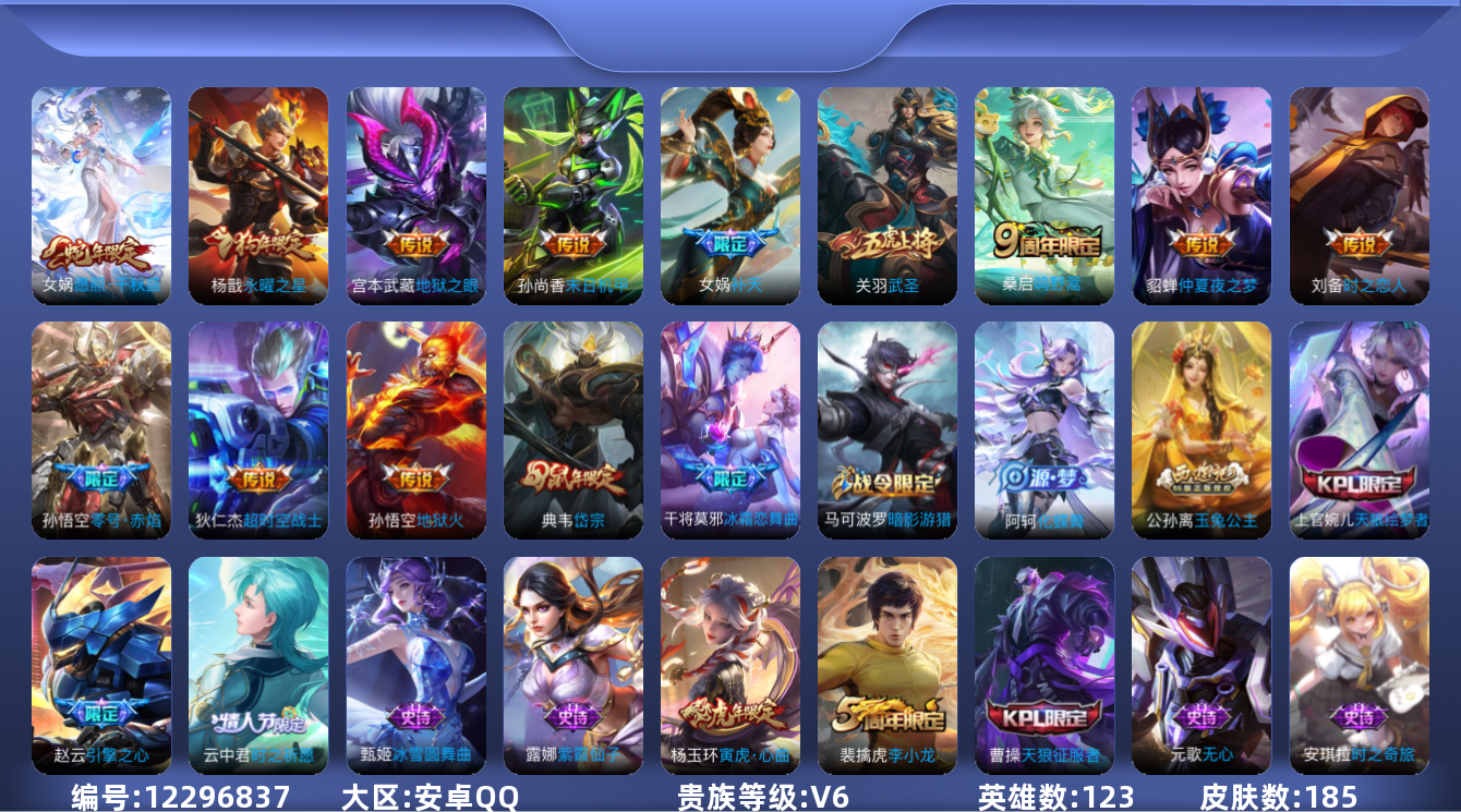[12296837]V6 12传说 123英雄 185皮肤 可修改实名 禁止排行榜2026年3月24日解除 女号 优质装备:末日机甲-孙尚香(绿蚂蚱),地狱火,仲夏夜之梦(大飞蛾),零号·赤焰,地狱之眼,时之恋人-刘备(电焊工),超时空战士-狄仁杰 珍宝阁皮:女武神 限定皮:愿照·千秋盛(女娲年限),鸣野蒿,补天,玄嵩(庄周年限),匿光决锋者,五谷丰年,武圣,天狼运算者,梁祝,岱宗(典韦年限),天狼征服者,天狼绘梦者,李小龙,永曜之星,真爱至上,纯白花嫁,引擎之心,冰霜恋舞曲,寅虎·心曲(虎婆),时之祈愿-云中君,玉兔公主,梦圆繁星 史诗皮:化蝶舞,茶境仙,奇遇星旅,紫霞仙子,白龙吟,千年之狐,龙骑士(小龙虾),冰冠公主,电玩·爆裂旋风,猫狗日记-大乔,乱世虎臣,水果甜心,绅士熊喵,星夜王子,心灵骇客,时之奇旅-安琪拉,德古拉伯爵,幽灵船长,鬼剑武藏,心灵战警,拒霜思,缤纷独角兽,水晶猎龙者,鹰眼统帅,魅力维加斯,无心,未来纪元-赵云