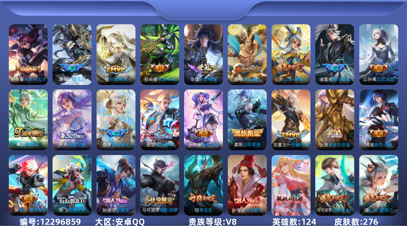 [12296859]V8 1典藏 19传说 124英雄 276皮肤 可修改实名 优质装备:杀手不太冷,黄金白羊座,炽阳神光,一念神魔,末日机甲-孙尚香(绿蚂蚱),音你心动-周瑜,挚爱花嫁,音你闪耀(rap皮),山海·琳琅生(小乔年限),炽翼辉光(娃娃菜牛角包),记忆之芯(机甲兔),百相守梦(张飞),追逃游戏(亚瑟),电玩·雷克斯,鹤羽星尊,灼幽烈阳,遇见神鼓 珍宝阁皮:妄想食味,胡桃夹子 限定皮:鸣野蒿,夏侯惇霜北刀,至尊宝,飞衡(韩信年限),玄嵩(庄周年限),山海·碧波行(瑶年限),五谷丰年,青龙志(铠年限),天狼运算者,梁祝,天狼狩猎者,李小龙,霸王别姬-虞姬,默契交锋-花木兰,大圣娶亲,引擎之心,云端筑梦师,美猴王,时之祈愿-云中君,山海·玄木吟(马可年限) 史诗皮:破空之剑,涂山红红,蒙犽顽岩魄,夜落电台,奇遇星旅,紫霞仙子,特工魅影,千年之狐,江河有灵,魅语,匿光破解者,青蛇,偶像歌手,晚萤,龙骑士(小龙虾),末日机甲-吕布,猫狗日记-孙策,时之恋人-孙尚香,乱世虎臣,节奏热浪,修罗,摇滚巨星,水果甜心,天才门将,星夜王子,心灵骇客,德古拉伯爵,暗隐猎兽者,鬼剑武藏,心灵战警,舞动绿茵,地狱岩魂,纤云弄巧,繁星吟游(呼啦呼啦),缤纷独角兽,乘风破浪,逐浪之夏,曙光守护者,热力回旋,金属风暴,圣诞狂欢,圣诞恋歌,鹰眼统帅,魅力维加斯,滕王阁序,无心