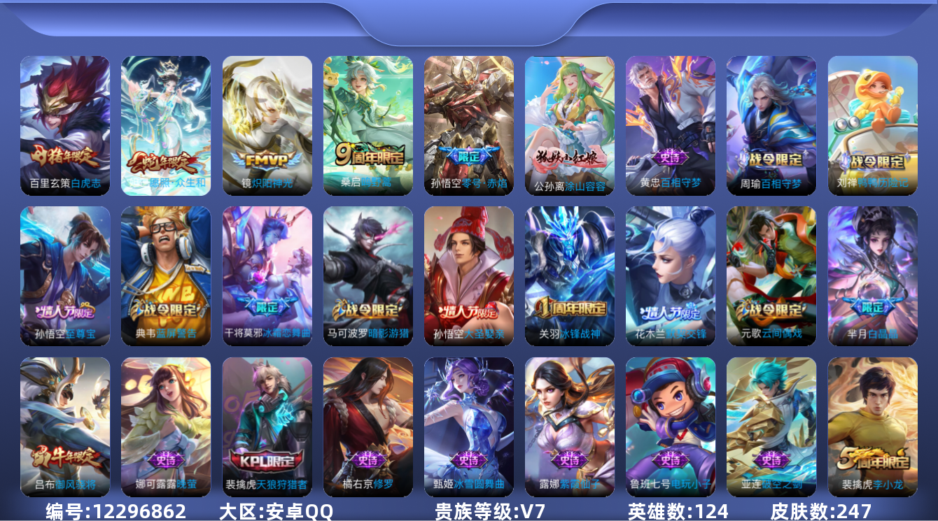 [12296862]V7 5传说 124英雄 247皮肤 可修改实名 优质装备:炽阳神光,零号·赤焰,涂山容容 珍宝阁皮:优雅恋人,蔷薇恋人 限定皮:愿照·众生和(妲己年限),鸣野蒿,至尊宝,白虎志(电光耗子),白晶晶,冰锋战神,梁祝,御风骁将(吕布年限),天狼狩猎者,逐梦之星,天狼溯光者,李小龙,逐梦之光,霸王别姬-项羽,霸王别姬-虞姬,默契交锋-花木兰,大圣娶亲,冰霜恋舞曲 史诗皮:鸭鸭历险记-刘禅,星界战将,百相守梦-周瑜,茶境仙,破空之剑,蔬乡物语(鲁班七号),百相守梦-百里守约,百相守梦-黄忠,紫霞仙子,苍穹之光,电玩小子(小书包),黄金分割率,特工魅影,千年之狐,冰冠公主,偶像歌手,白蛇,晚萤,暗夜猫娘,猫狗日记-孙策,时之恋人-孙尚香,乱世虎臣,节奏热浪,修罗,女仆咖啡,天才门将,星夜王子,心灵骇客,功夫厨神,德古拉伯爵,暗隐猎兽者,幽灵船长,鬼剑武藏,心灵战警,乐园奇幻夜,地狱岩魂,诗语江南,纤云弄巧,繁星吟游(呼啦呼啦),缤纷独角兽,乘风破浪,逐浪之夏,鹰眼统帅,暗夜贵公子,魅力维加斯,黎明之约,未来纪元-赵云