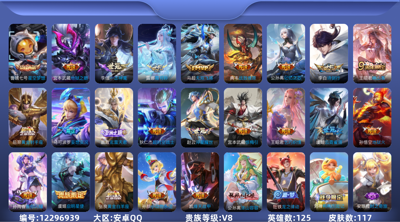 [12296939]V8 1典藏 22传说 125英雄 117皮肤 可修改实名 优质装备:星空梦想(太空人),黄金射手座,绛天战甲(鸡嘴战神),黄金白羊座,一念神魔,云霓雀翎,地狱火,地狱之眼,乞巧织情,淬星耀世,超时空战士-狄仁杰,无双飞将,音你闪耀(rap皮),记忆之芯(机甲兔),妄想实况,惊梅引,小动物乐团,霜月吟,玄雷天君,涂山容容 传说皮:典韦战鼓燎原 限定皮:映山客,诗剑行 史诗皮:鸭鸭历险记-刘禅,龙之律动,战舞者,百相守梦-百里守约,星界特工,白龙吟,特工魅影,永昼,闲日渔趣,冰冠公主,暗夜猫娘,龙骑士(小龙虾),乱世虎臣,女仆咖啡,摇滚巨星,水果甜心,天才门将,时之奇旅-安琪拉,乐园奇幻夜,舞动绿茵,纤云弄巧,逐浪之夏,月团寄思,水晶猎龙者,箭羽风息,圣诞狂欢,鹰眼统帅,魅力维加斯,天秀·音浪