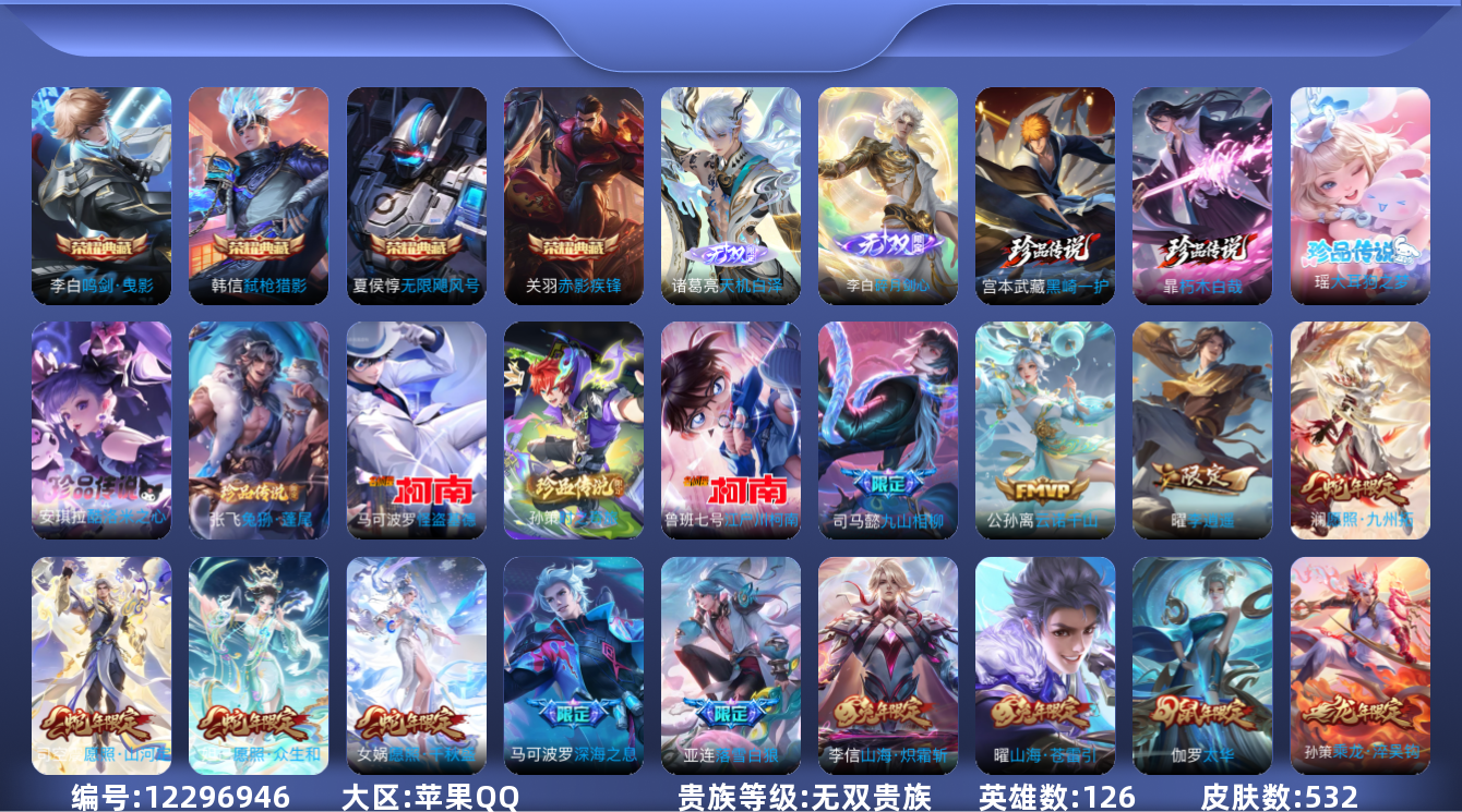 [12296946]无双贵族 4典藏 2无双 8珍品传说 68传说 126英雄 532皮肤 典藏英雄武则天 可修改实名 优质装备:无限飓风号(高达),鸣剑·曳影,赤影疾锋,弑枪猎影(韩信典藏),碎月剑心(李白无双),天机白泽,江户川柯南,怪盗基德,酷洛米之心,大耳狗之梦,朽木白哉,黑崎一护,黄金狮子座,黄金射手座,云鹰飞将(小将军),绛天战甲(鸡嘴战神),黄金白羊座,猫影幻舞,久胜战神,炽阳神光,一念神魔,云霓雀翎,末日机甲-孙尚香(绿蚂蚱),地狱火,音你心动-小乔,零号·赤焰,海洋之心,地狱之眼,音你心动-周瑜,李逍遥,乞巧织情,时之恋人-刘备(电焊工),游龙清影(小青龙),淬星耀世,超时空战士-狄仁杰,末日机甲-孙策,挚爱之约,无双飞将,天秀幻梦,山海·炽霜斩(李信年限),山海·琳琅生(小乔年限),山海·苍雷引(电光曜子),燃星之曲,画中仙,浮生妄,百相守梦(张飞),鹤羽星尊,灼幽烈阳,妄想实况,惊梅引,澜逐花归海,艾琳觅芳踪,黄金天蝎座,牧神诗旅,玄雷天君 珍品传说:时之奇旅-孙策,兔狲·蓬尾 传说皮:乘龙·问璇玑(孙尚香年限),乘龙·铭钟鼎(赵云年限),乘龙·淬吴钩(孙策年限),落雪白狼,九山相柳,云诺千山,铠冥王哈迪斯,幻光神枪 珍宝阁皮:妄想食味,优雅恋人,蔷薇恋人,女武神 限定皮:愿照·九州拓(澜年限),愿照·山河定(司空震年限),愿照·众生和(妲己年限),愿照·千秋盛(女娲年限),逐霄战戟,映山客,陌上桑,鸣野蒿,夏侯惇霜北刀,至尊宝,太华(伽罗年限),傲雪梅枪,时之彼端,时雨天司(水龙头),飞衡(韩信年限),至美·乘鲤谣,遇见飞天,高山流水,诗剑行,齐天大圣,怒海麟威,降魔,五谷丰年,冰锋战神,幽恒(沐浴露),武圣,游园惊梦,梁祝,逐梦之翼,烈魂,天狼溯光者,奔雷神使(牛魔年限),李小龙,朱雀志(守约年限),永曜之星,辉光之辰,霸王别姬-项羽,圣诞老人,孙行者,猪悟能,大圣娶亲,天魔缭乱,青春决赛季,百木心枪,深海之息(深海大菠萝),时之奇旅-妲己,神器·万象笔,冰霜神祇 史诗皮:鸭鸭历险记-刘禅,苍鳞隐世,器灵·浮梦炉,糖绘人间,狼魂孤将,绮世丹青,瑰影绮梦,化蝶舞,灵蛊蚀心,星界战将,谪仙醉月,龙之律动,雪豹·霜爪,藏狐·褐绒,布丁狗之誓,小牛鸭,石田雨龙,百相守梦-周瑜,戍鼓铭心,茶境仙,幻珠鲛人,怒海争锋,炽弈燎原,撼地雄心,破空之剑,战舞者,涂山红红,东